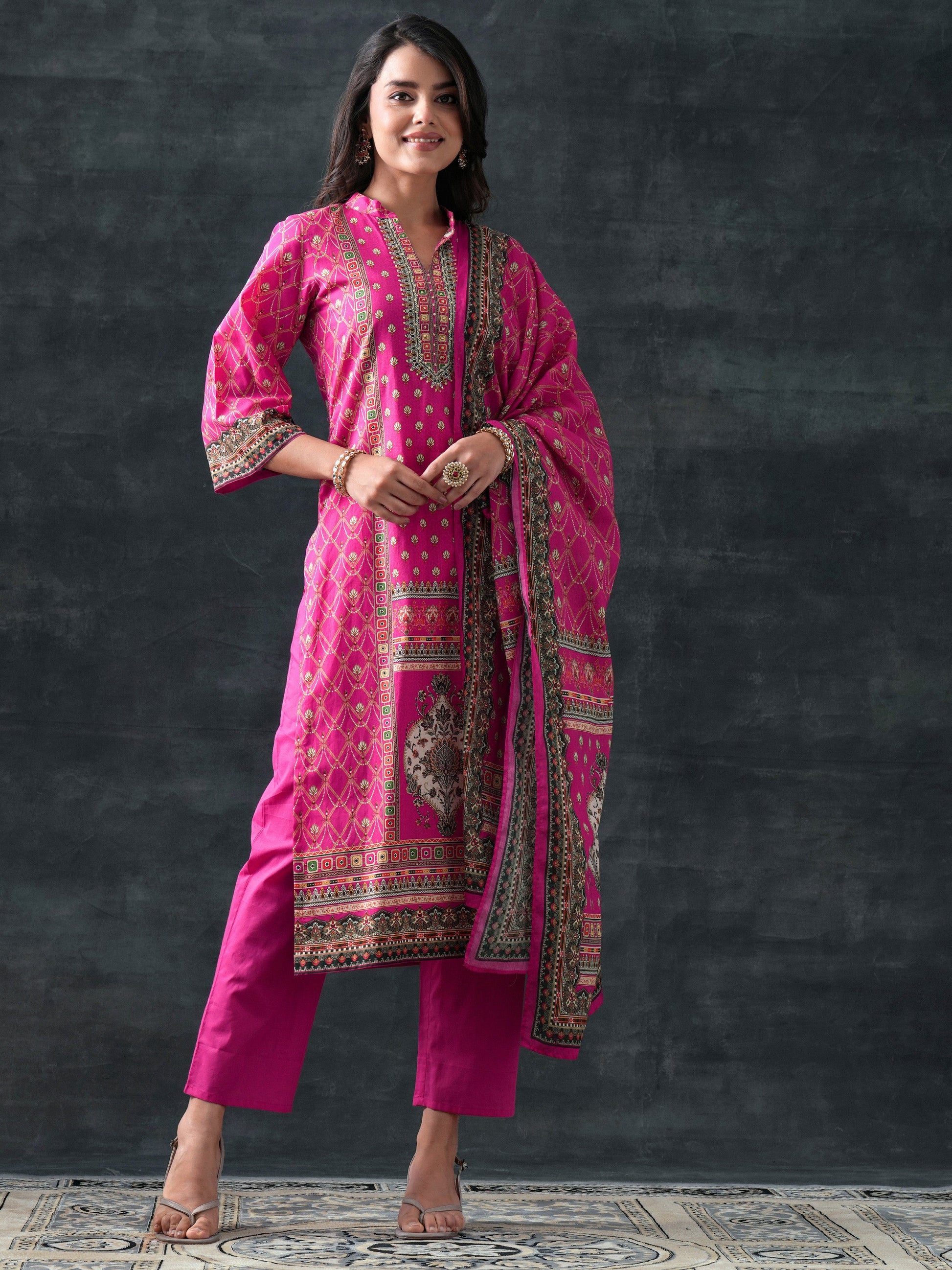 Pink Printed Cotton Straight Suit Set With Dupatta