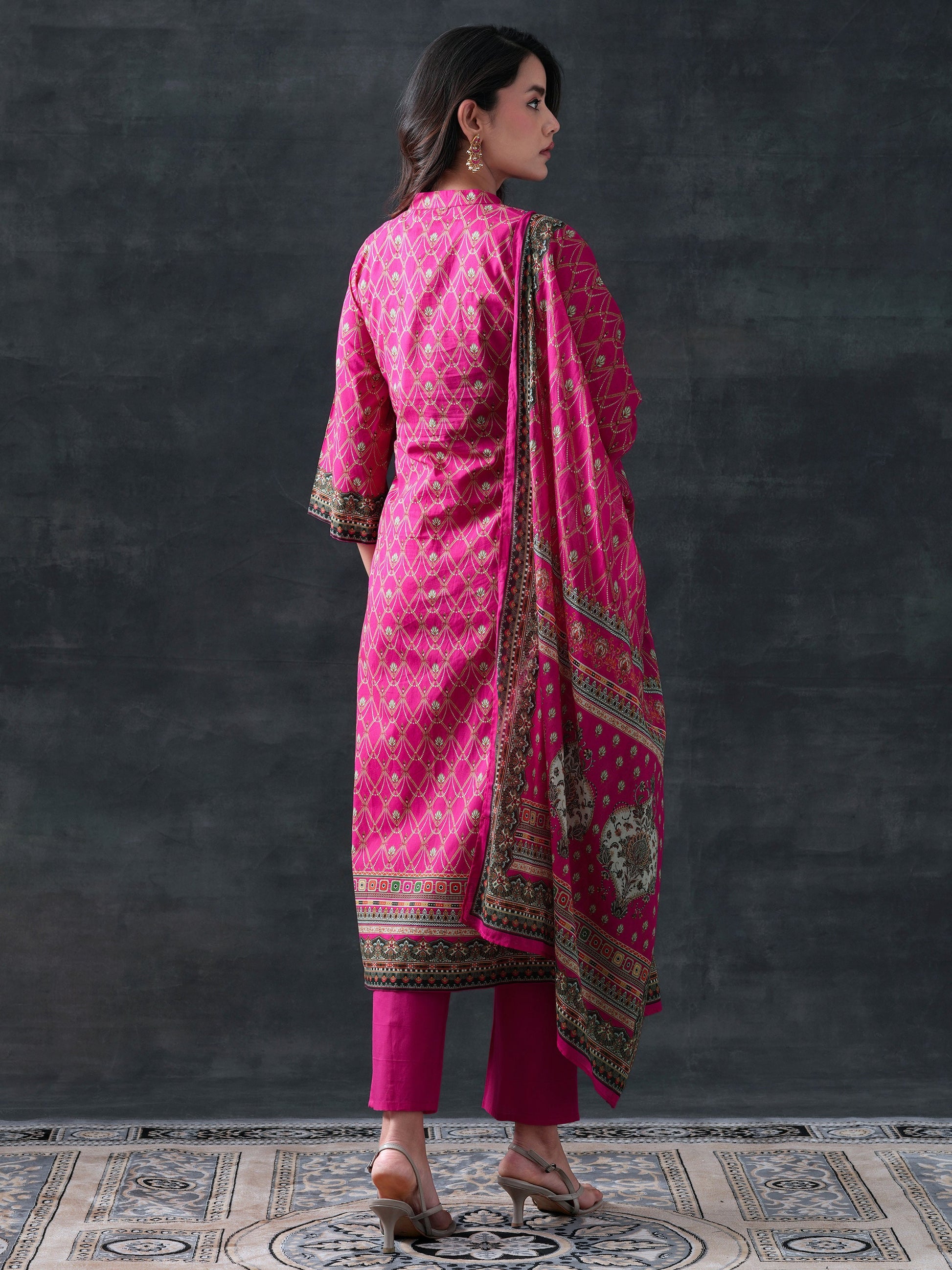 Our 3-piece pink cotton straight-fit kurta set features a mandarin neckline, regular sleeves. Complemented with straight pants with an partially elasticated waistband, and a printed dupatta. Adorned with floral prints, this style is perfect for semi festive occasions.