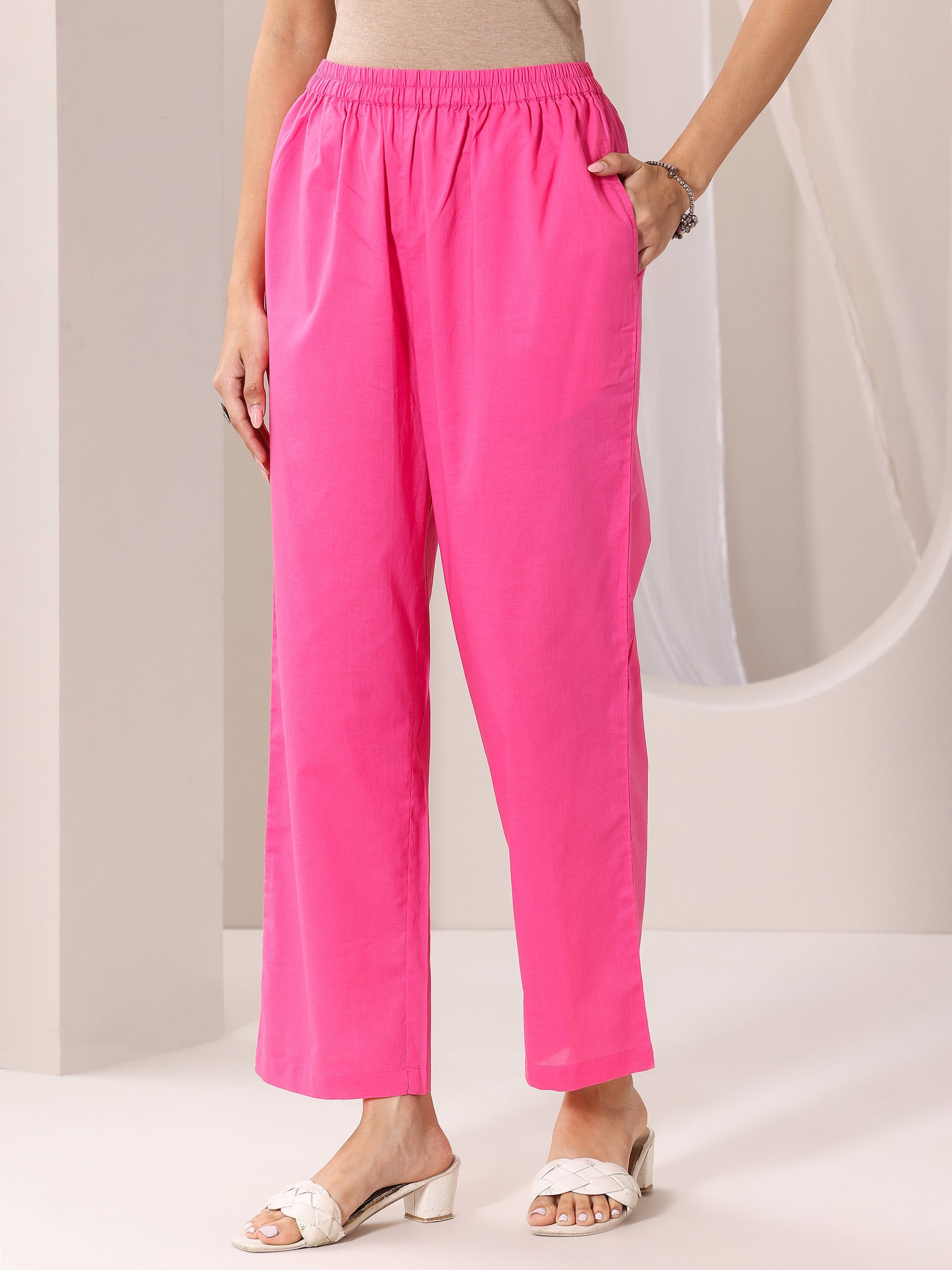 Our 3-piece pink multi cotton suit set features a straight-fit kurta with a round neckline, regular sleeves, and statement yoke. Complemented with straight pants with an elasticated waistband and a printed dupatta. Adorned with printed embellishments, this style is perfect for casual occasions.