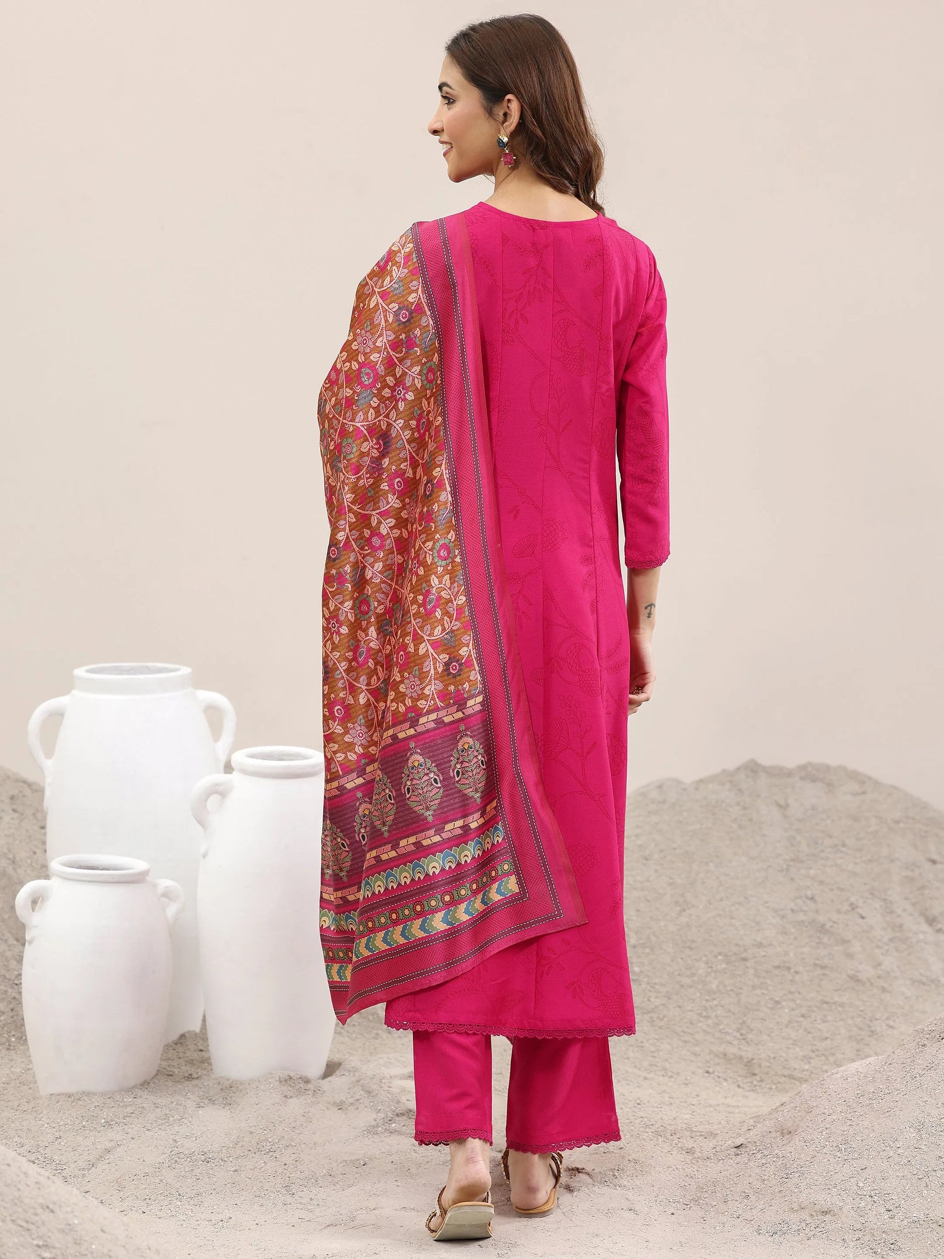 Pink Printed Silk Blend A-Line Kurta With Trousers & Dupatta