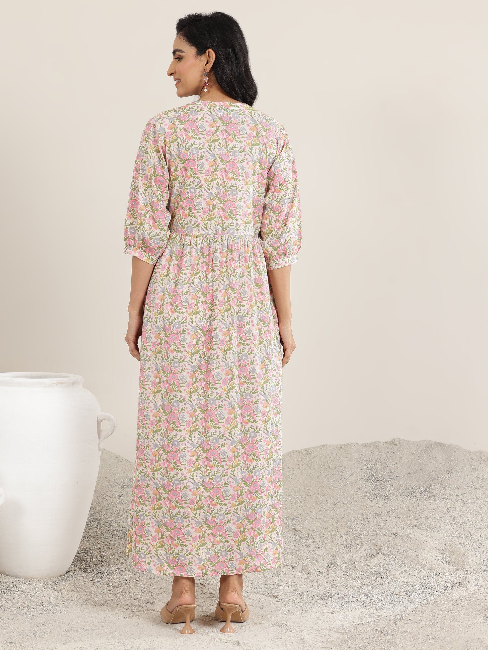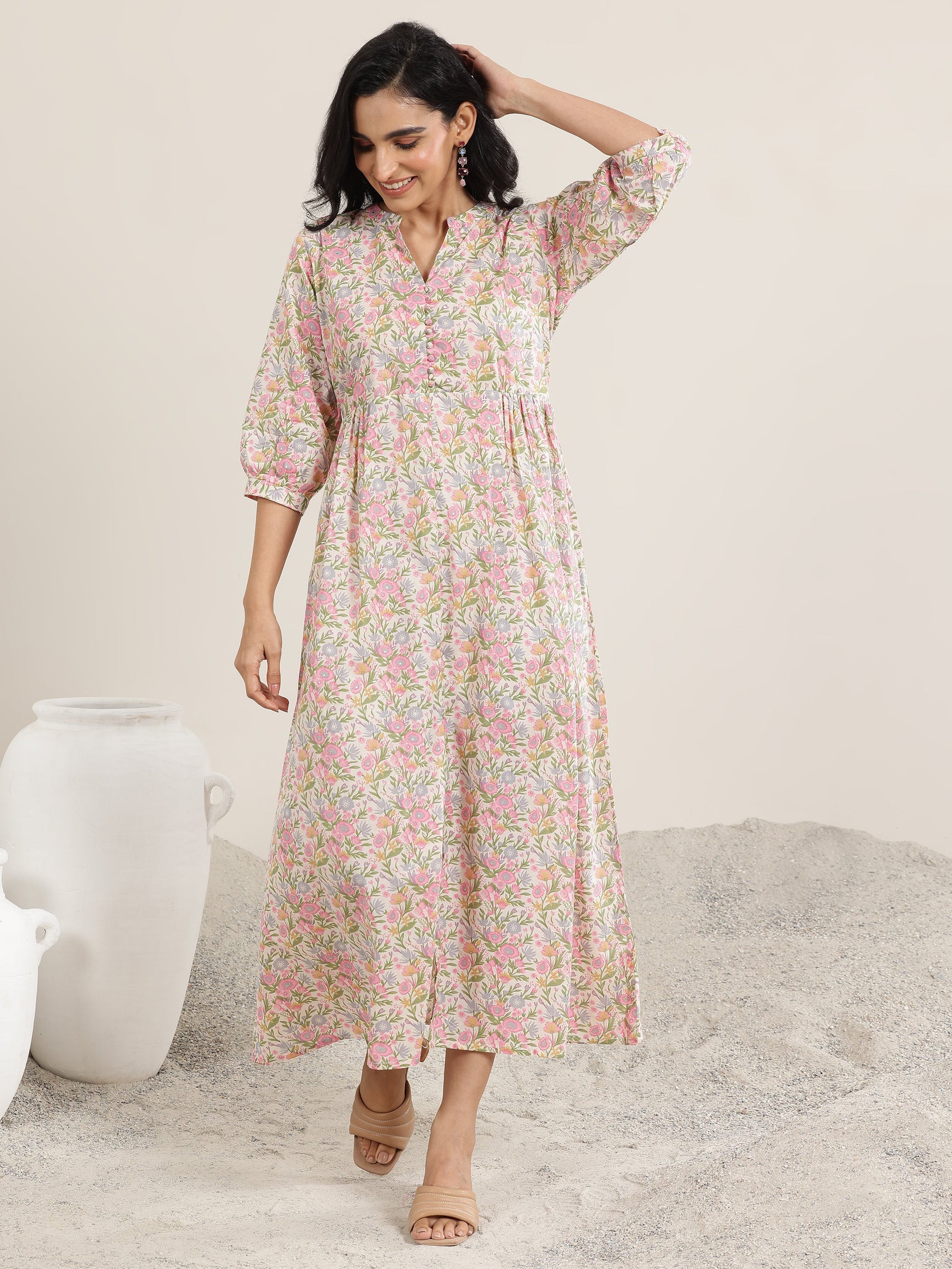 Our pink printed silk blend A-line dress features a mandarin notched neckline and three-quarter bishop sleeves. Highlighted with floral prints and handcrafted fabric button accents, this style is perfect for casual outings.