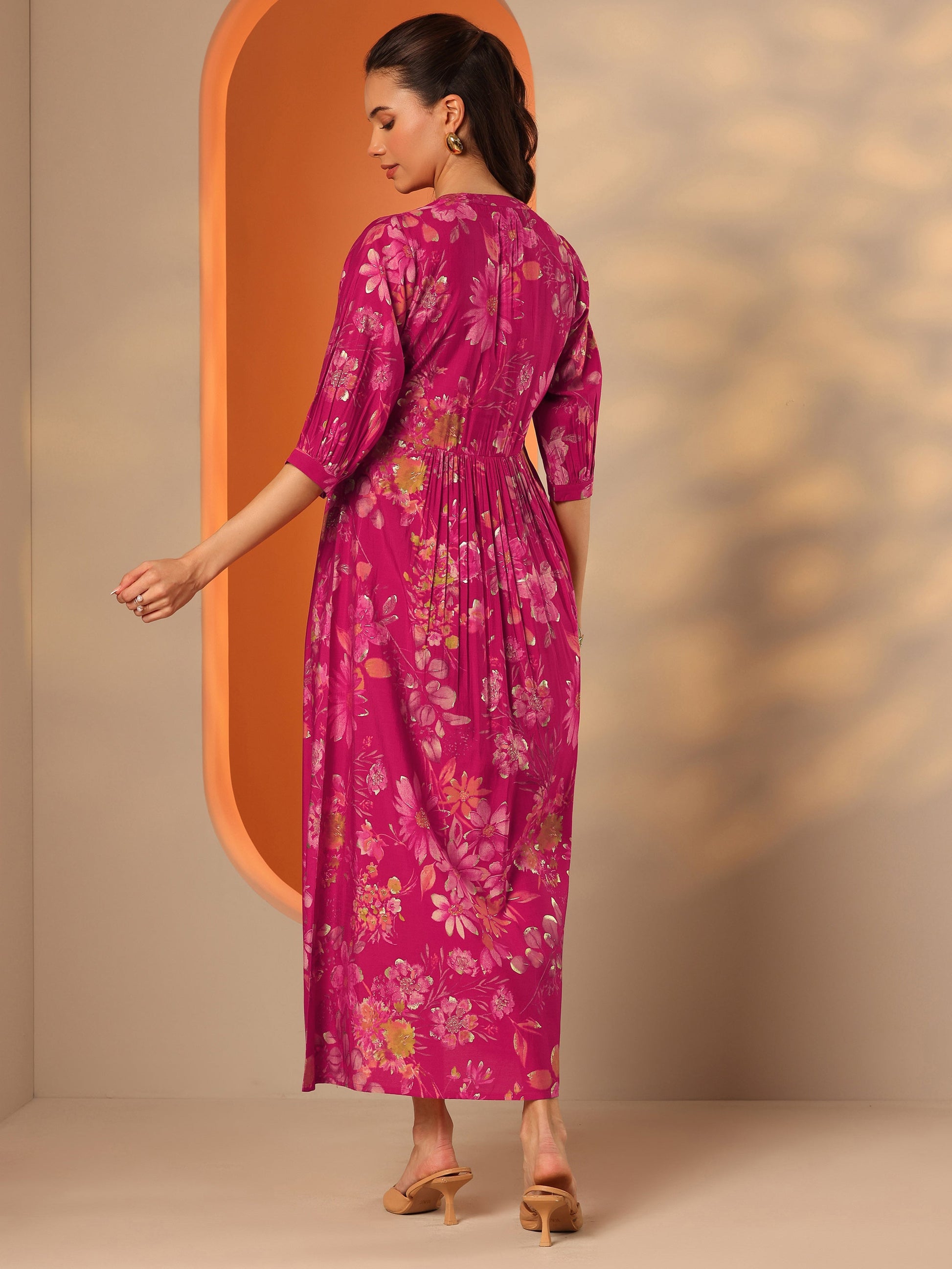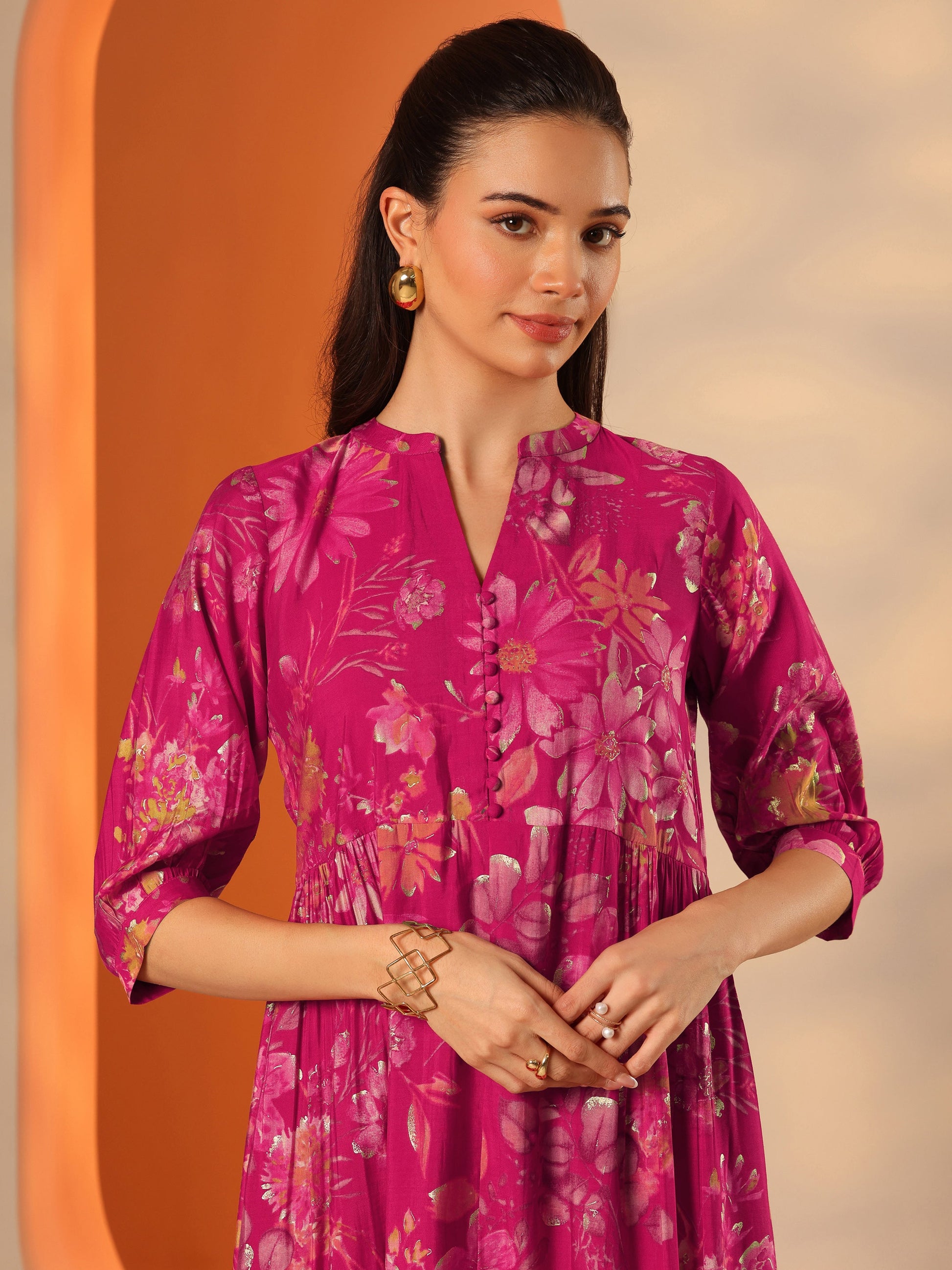 Our pink printed silk blend midi dress features a mandarin collar, three-quarter sleeves, and a flared hemline. Highlighted with captivating floral prints, this style is perfect for casual wear.