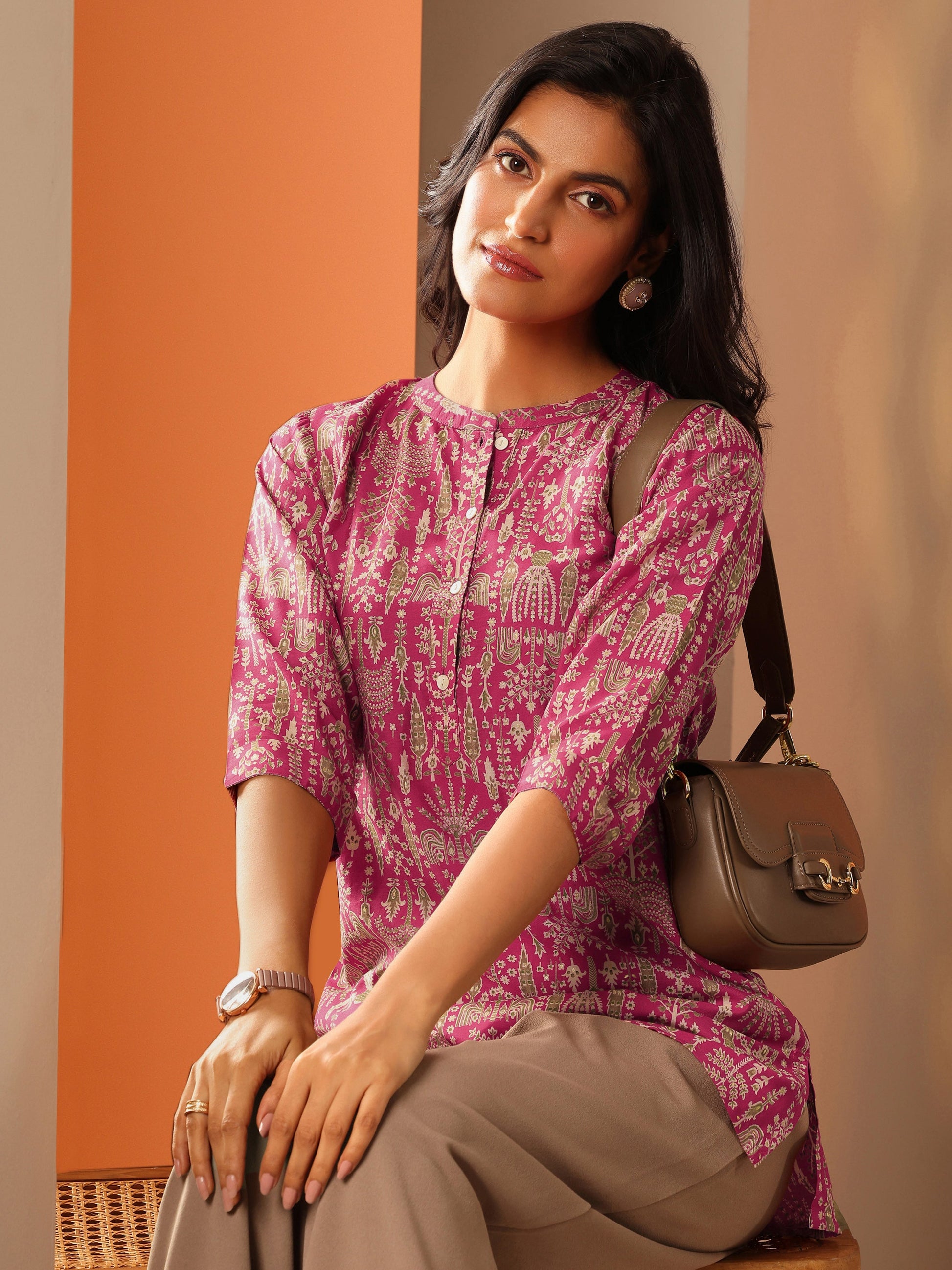 Our 1-piece pink silk blend straight-fit kurta features a mandarin collar neckline, regular sleeves. Adorned with ethnic motif printed, this style is perfect for casual wear.
