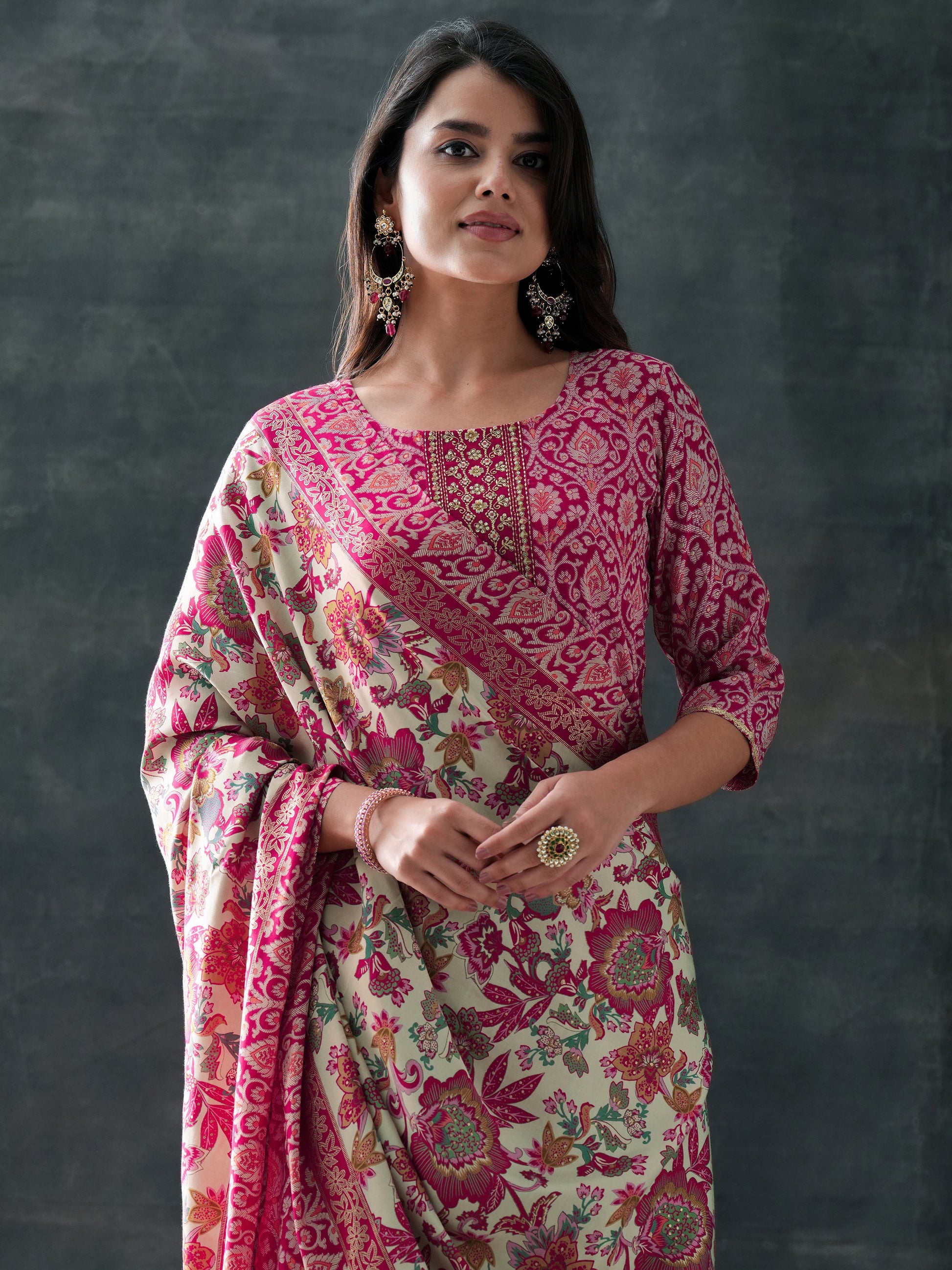 Pink Printed Silk Blend Straight Suit Set With Dupatta