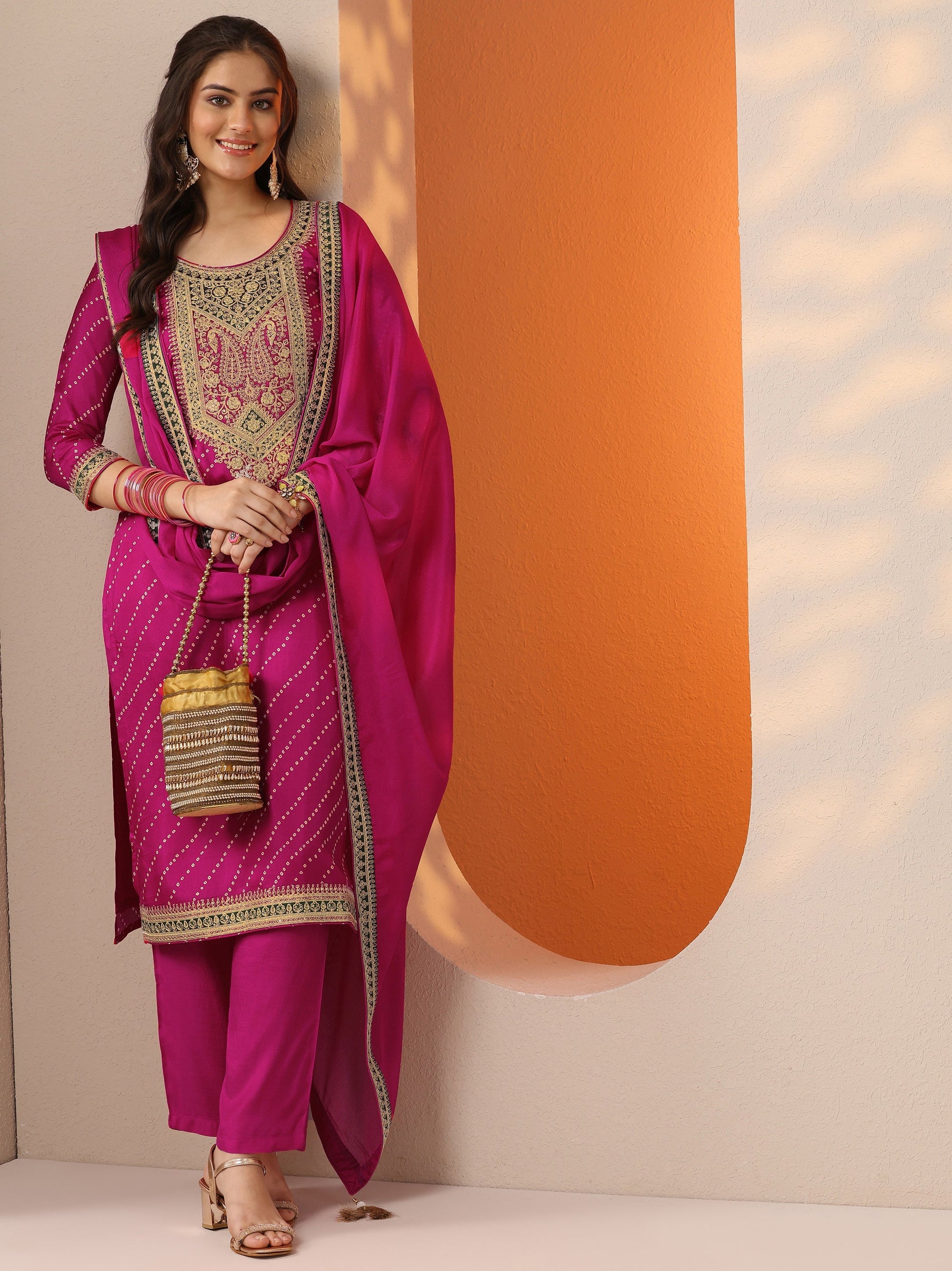 Pink Printed Silk Blend Straight Suit Set With Dupatta