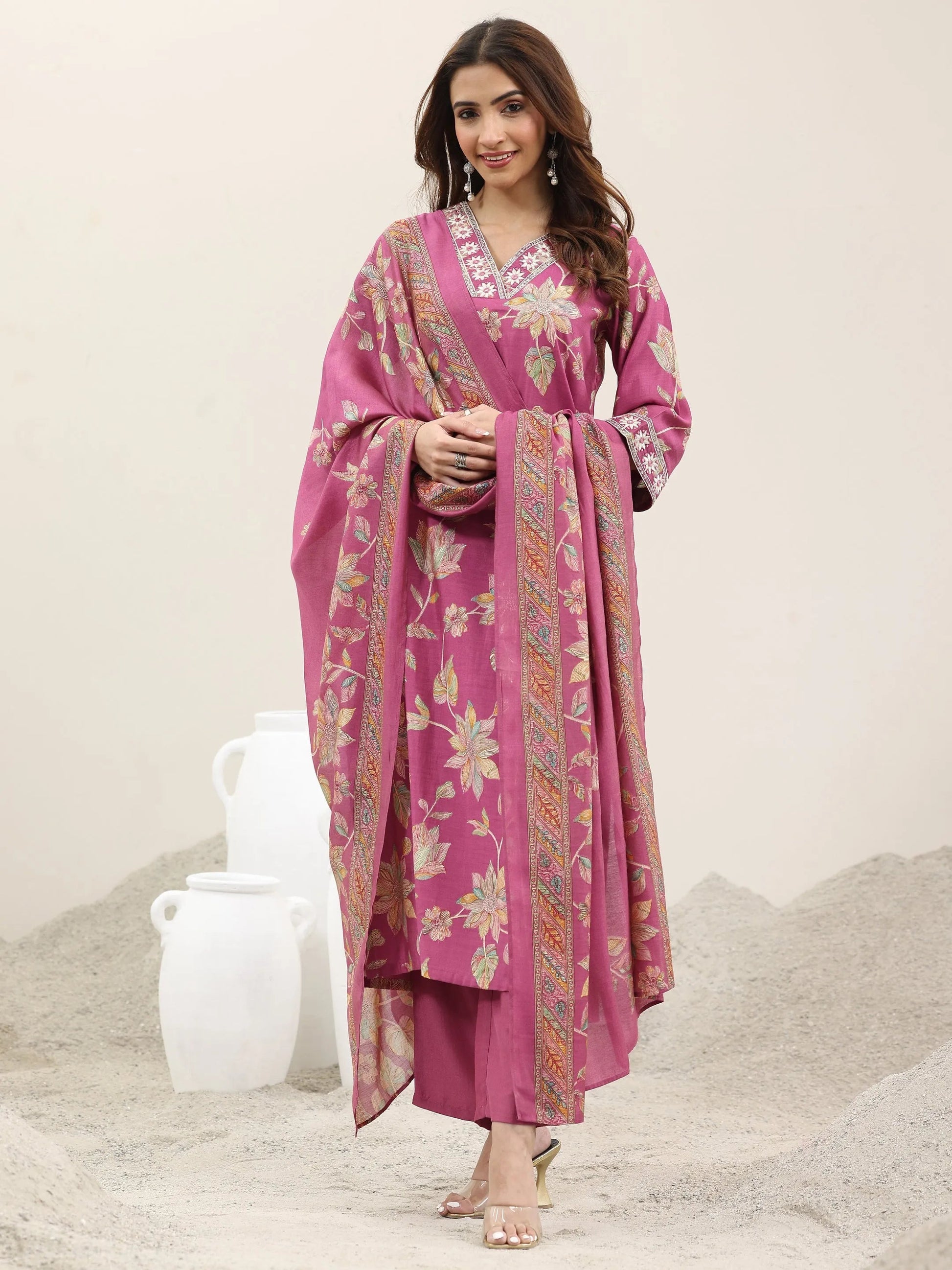 Pink Printed Silk Blend Straight Suit With Dupatta