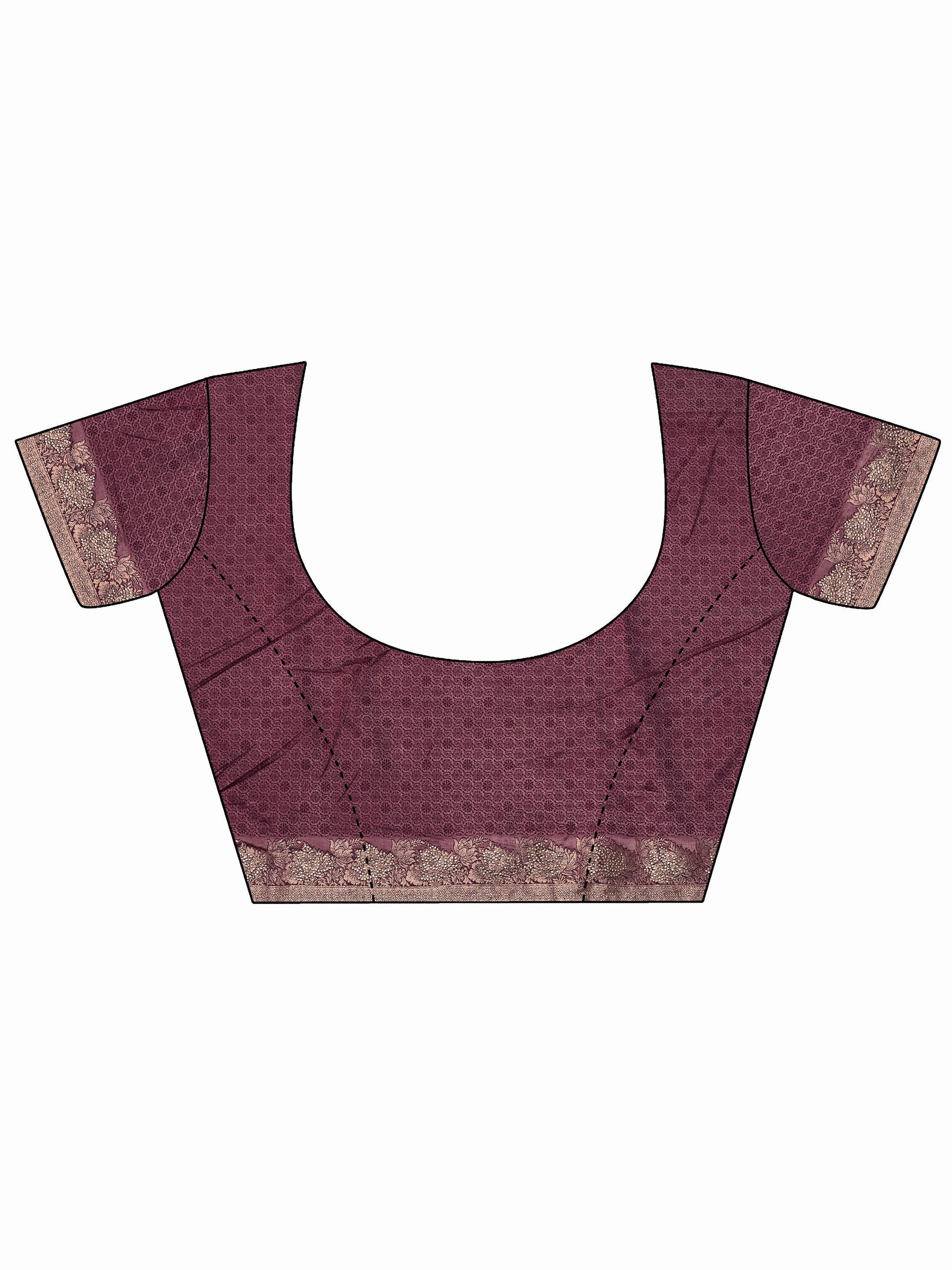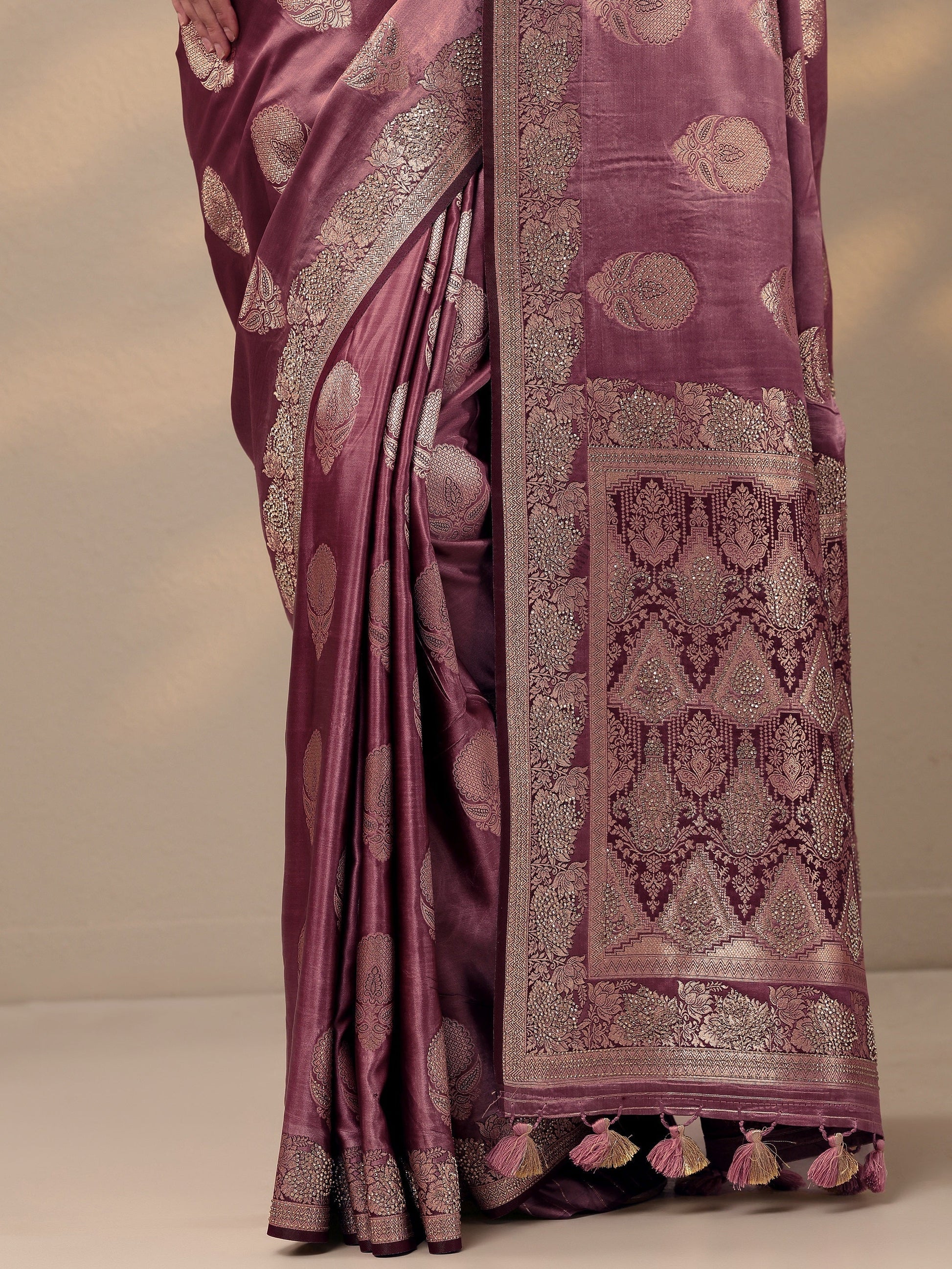 Our mauve printed silk blend saree features captivating embellishments. Complemented with a blouse piece. This charming saree is perfect for festive occasions.