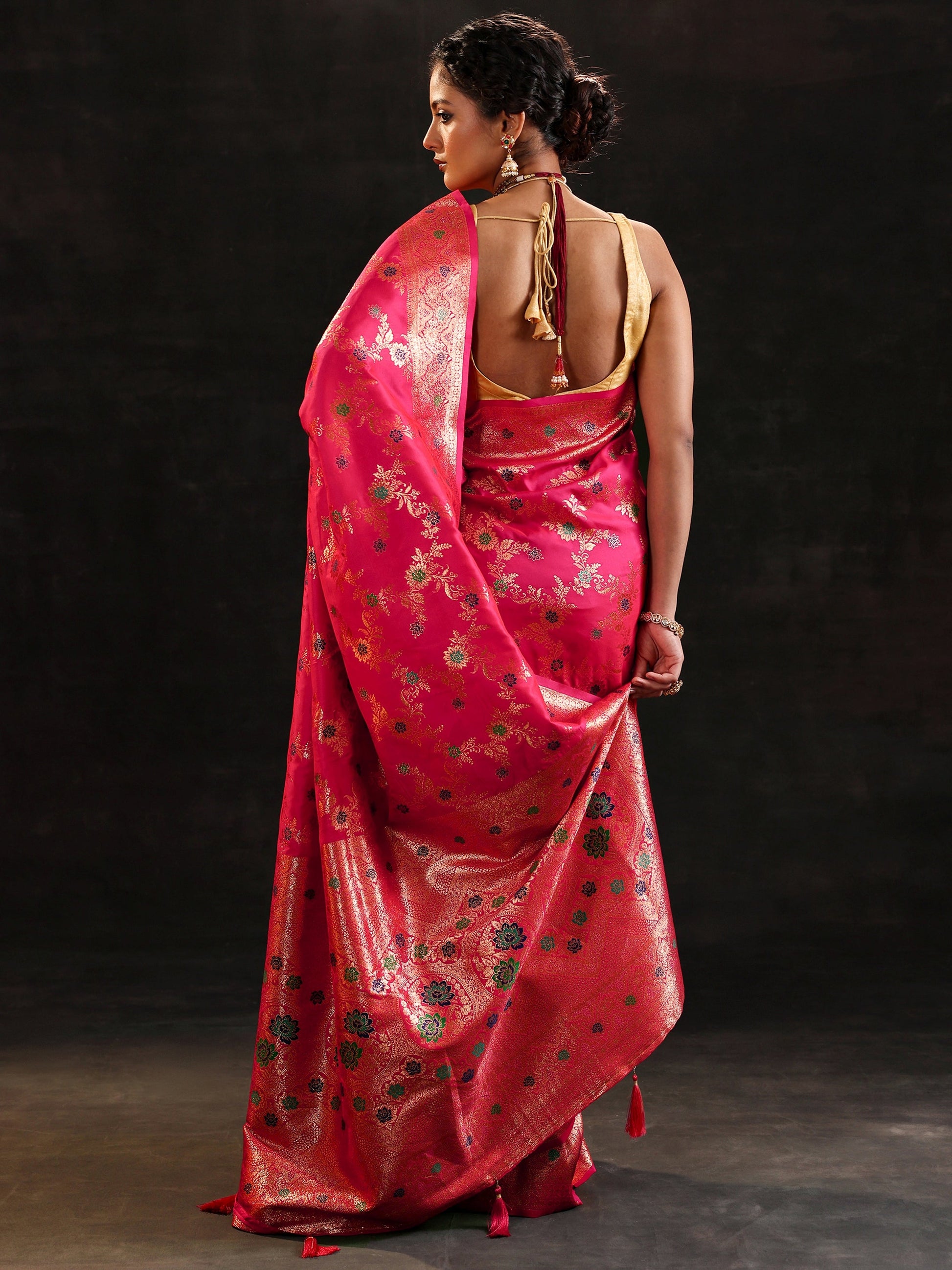 Our Pink Woven Design Silk Blend Saree Features Captivating Floral Print. Complemented With A Unstitched Blouse Piece. This Charming Saree Is Perfect For Festive Wear