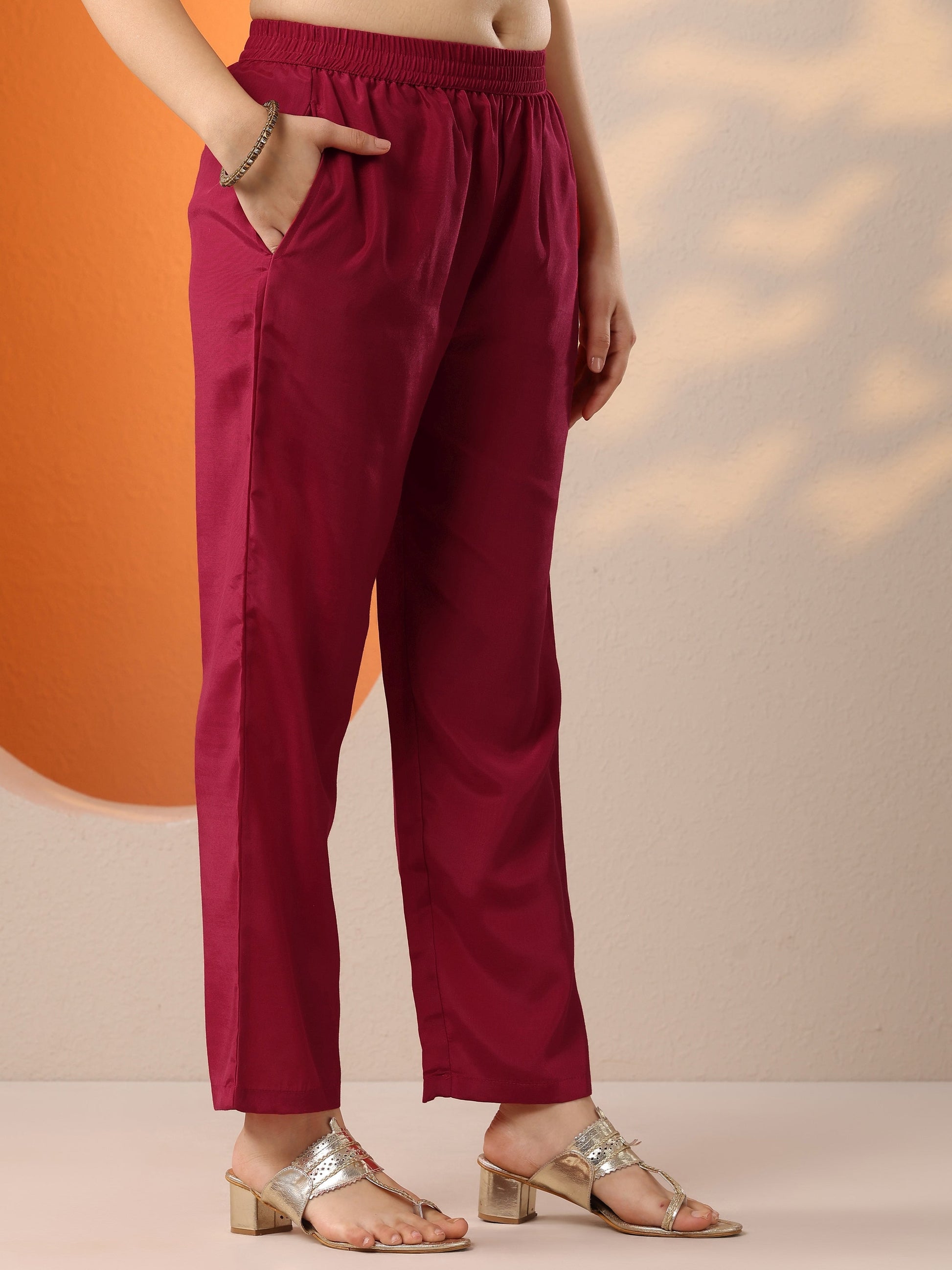 Our 3-piece maroon silk blend straight-fit kurta set features a round neckline, regular sleeves, and statement yoke. Complemented with straight pants with a partially elasticated waistband and 2 pockets, and an embroidered dupatta. Adorned with embroidered accents, this style is perfect for dark festive occasions.