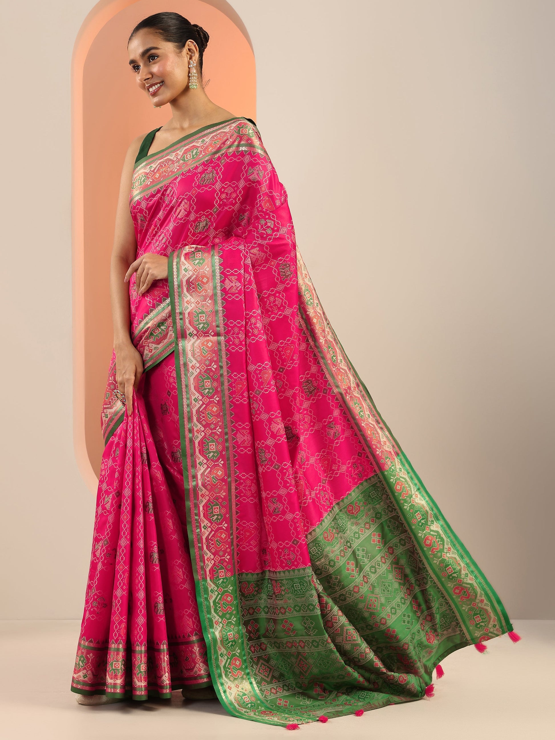 Our Pink Printed Silk Blend Saree Features Captivating Woven Print. Complemented With An Unstitched Blouse Piece. This Charming Saree Is Perfect For Festive Wear