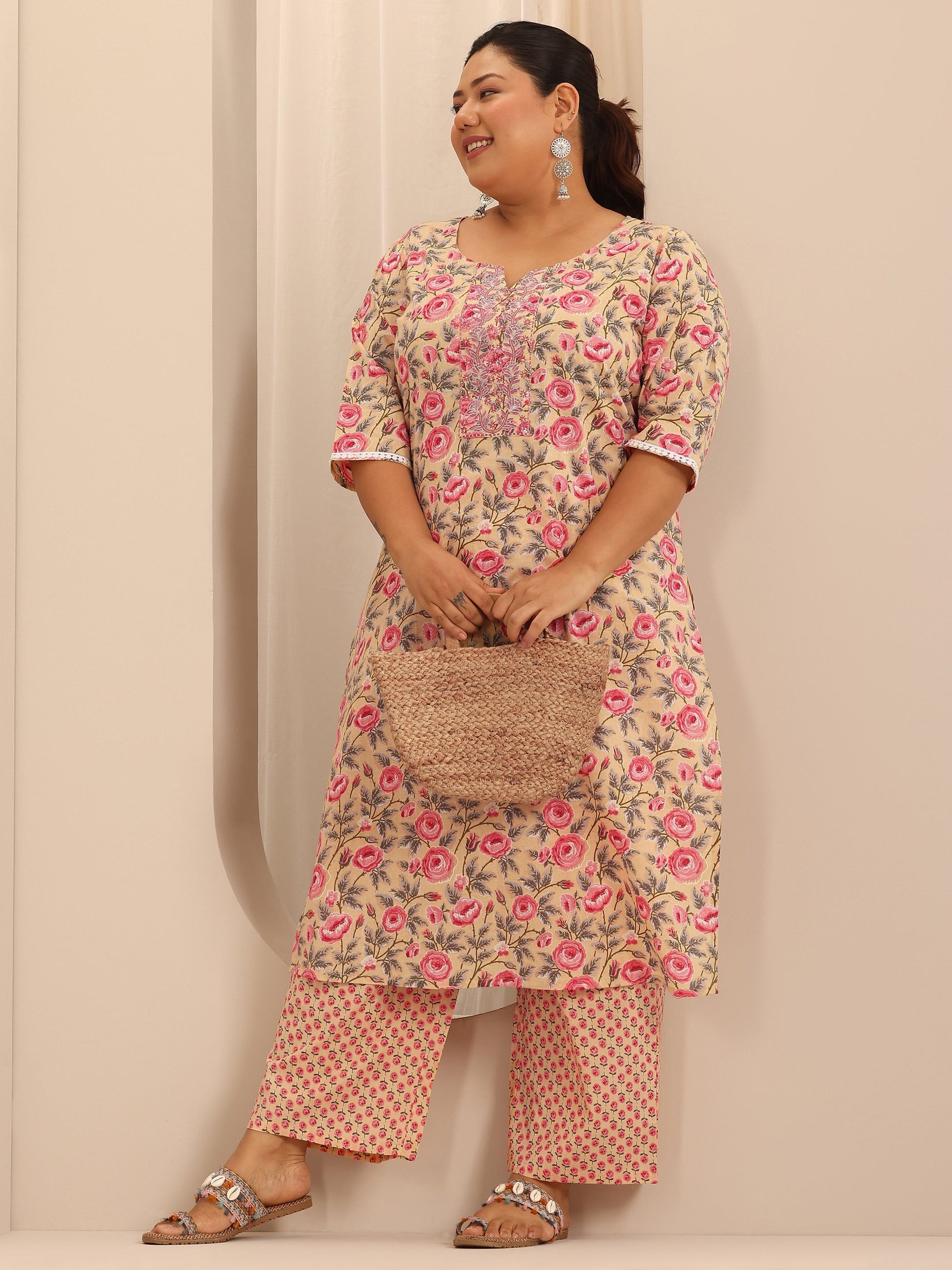 Plus Size Beige Printed Cotton Straight Kurta Set