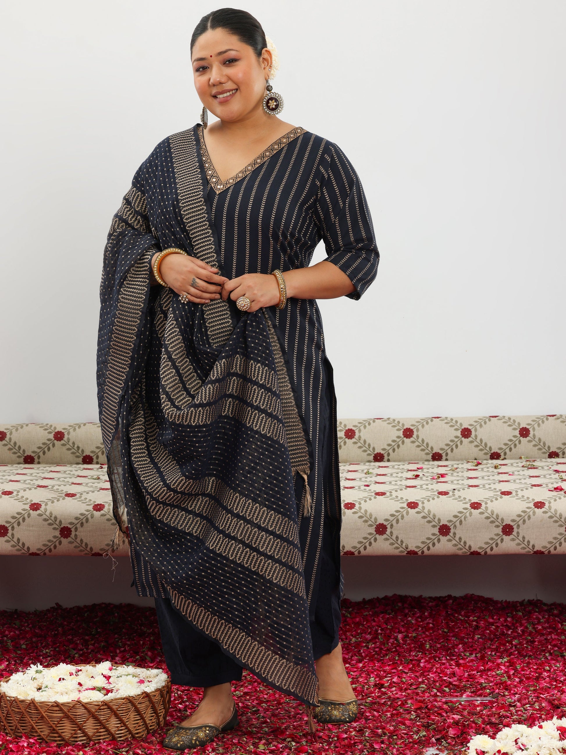 Libas Extra Love collection features our signature designs in comfortable plus sizes. Our 3-piece Navy Blue Cotton Blend features a Straight-fit Kurta Set with a V-neckline, Regular Sleeves, and statement Yoke. Complemented with Straight Pants with an Elasticated waistband and a Printed dupatta. Adorned with Self Design, this style is perfect for Casual occasions.