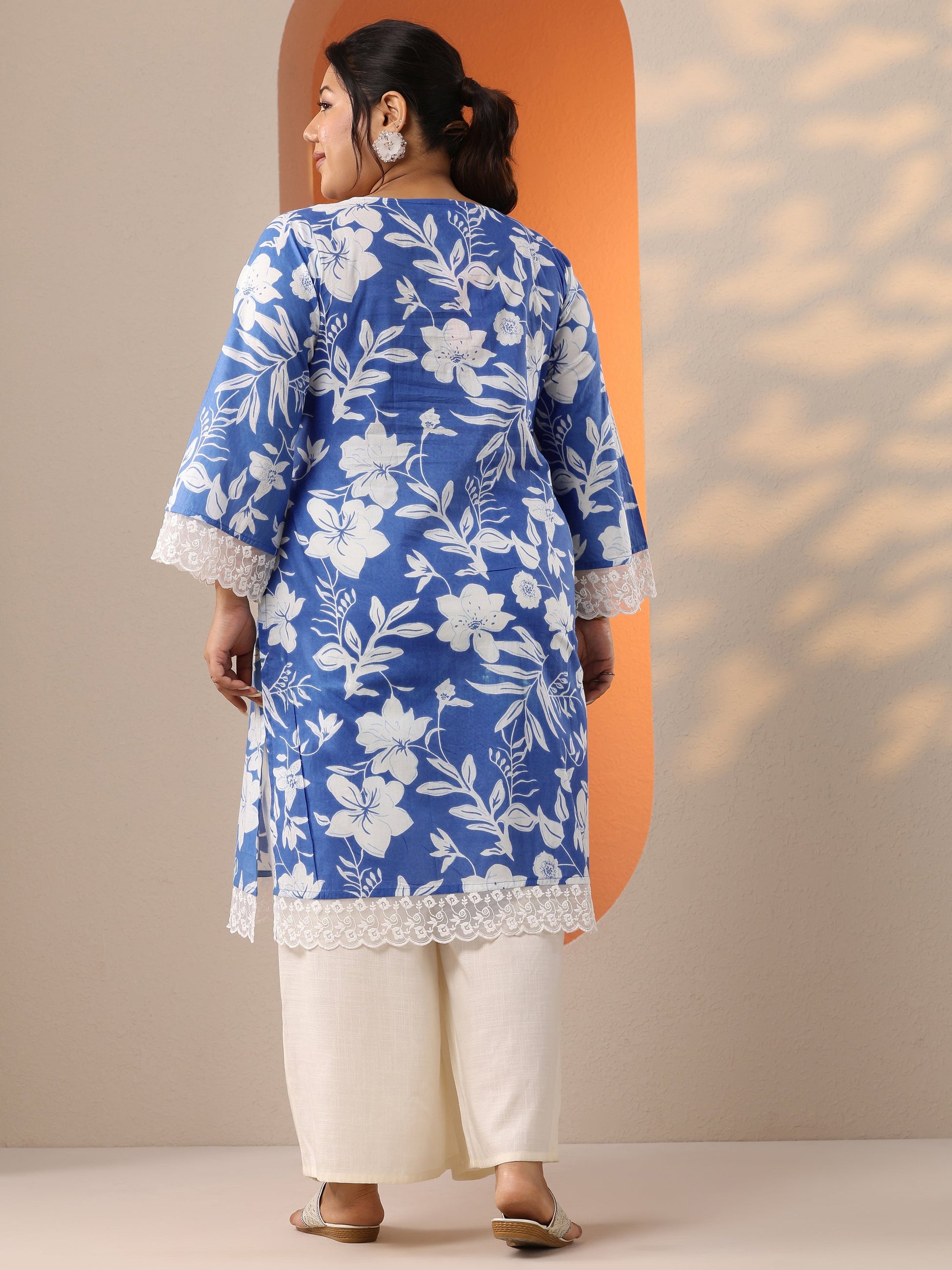 Our 1-piece blue cotton straight-fit kurta features a V-neckline, regular sleeves, and statement Yoke. Adorned with top print, this style is perfect for festive occasions.