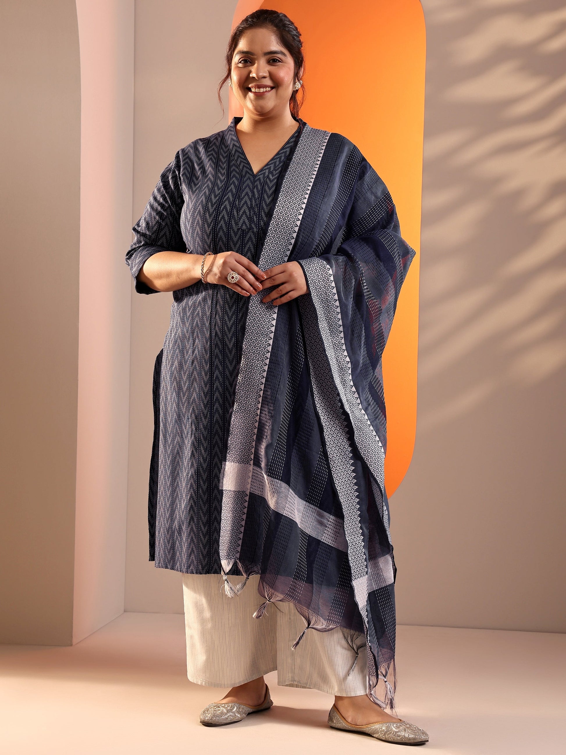 Plus Size Blue Woven Design Cotton Blend Straight Suit Set With Dupatta