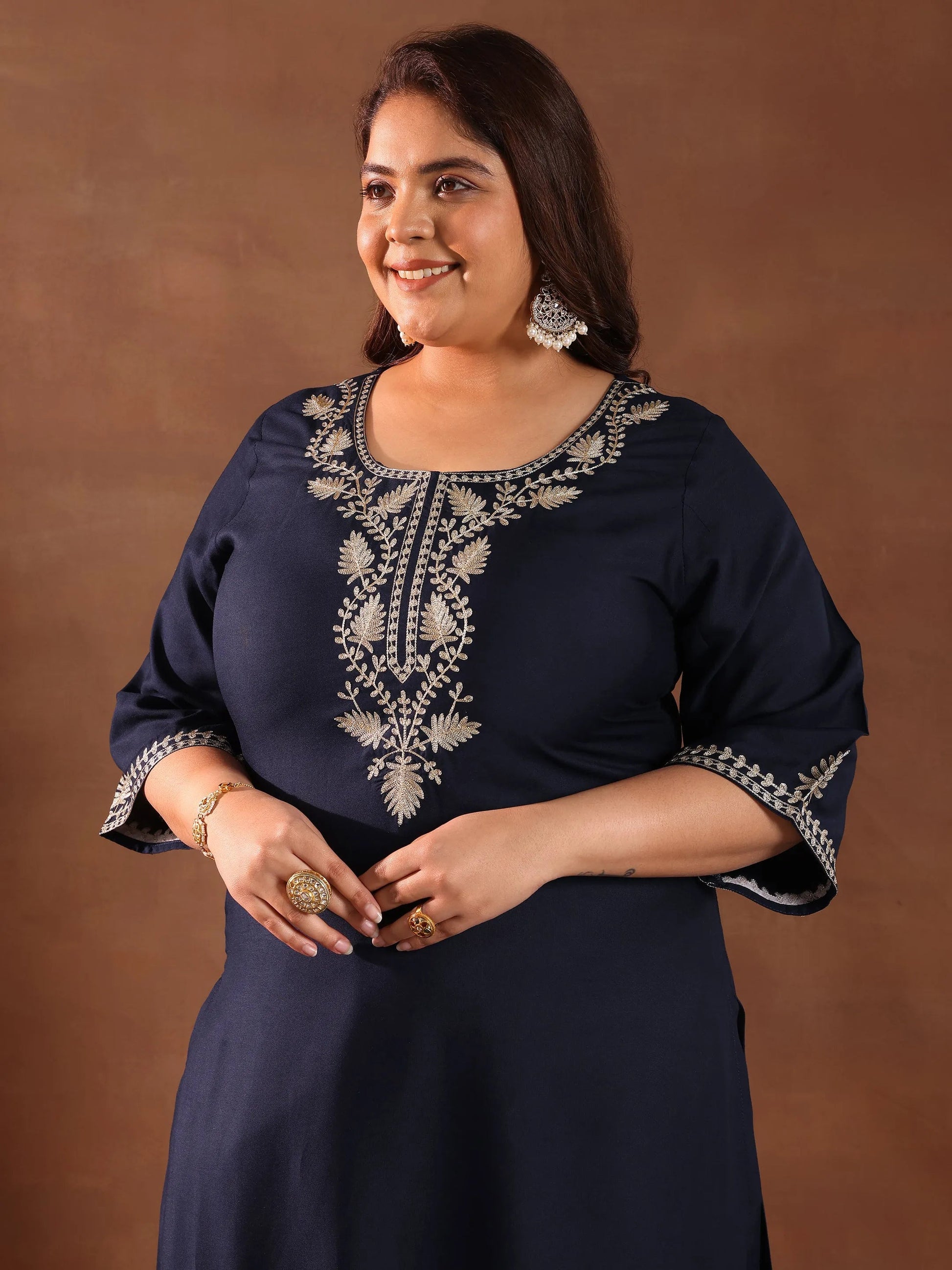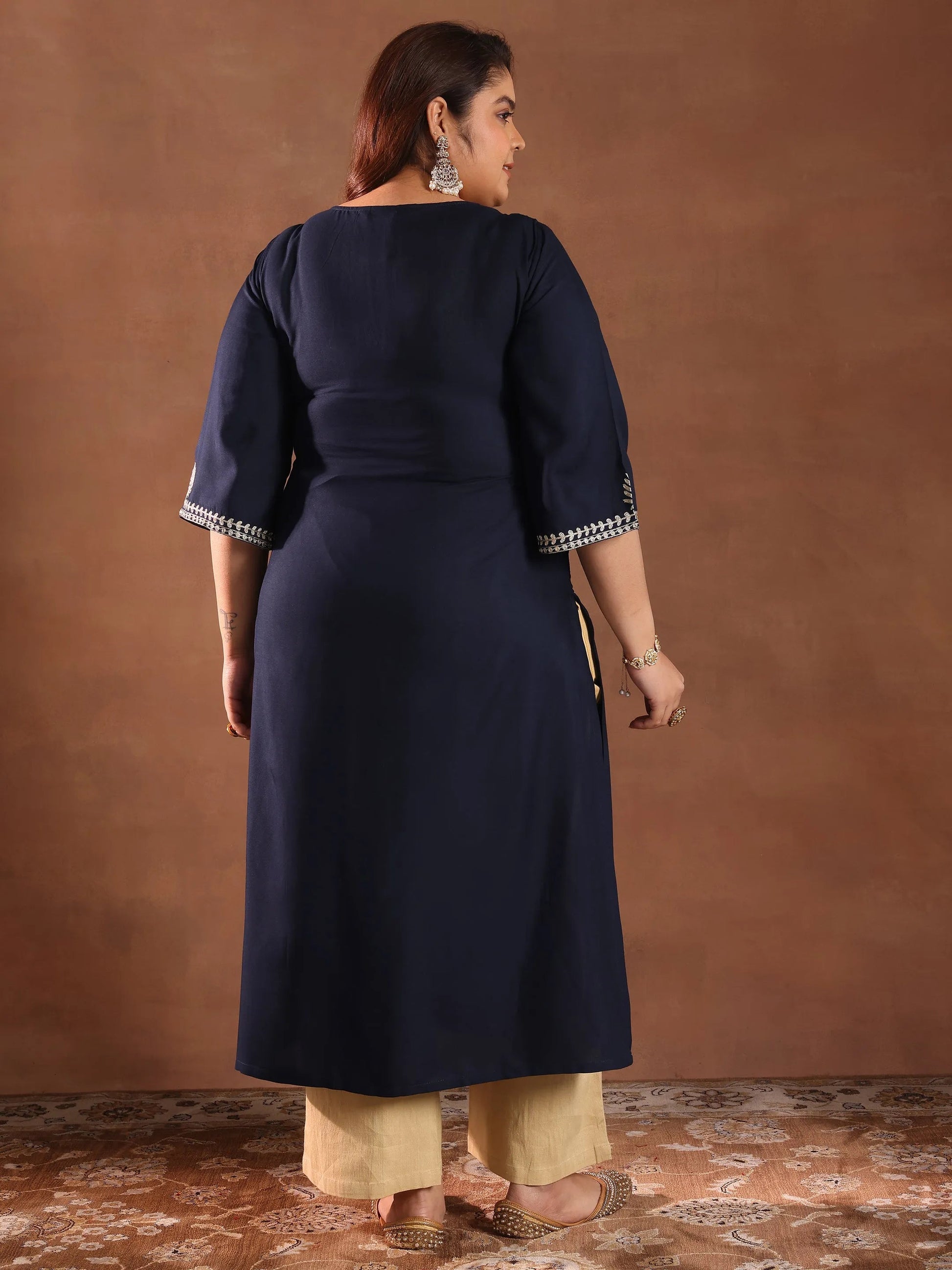 Plus Size Blue Yoke Design Rayon Straight Kurta