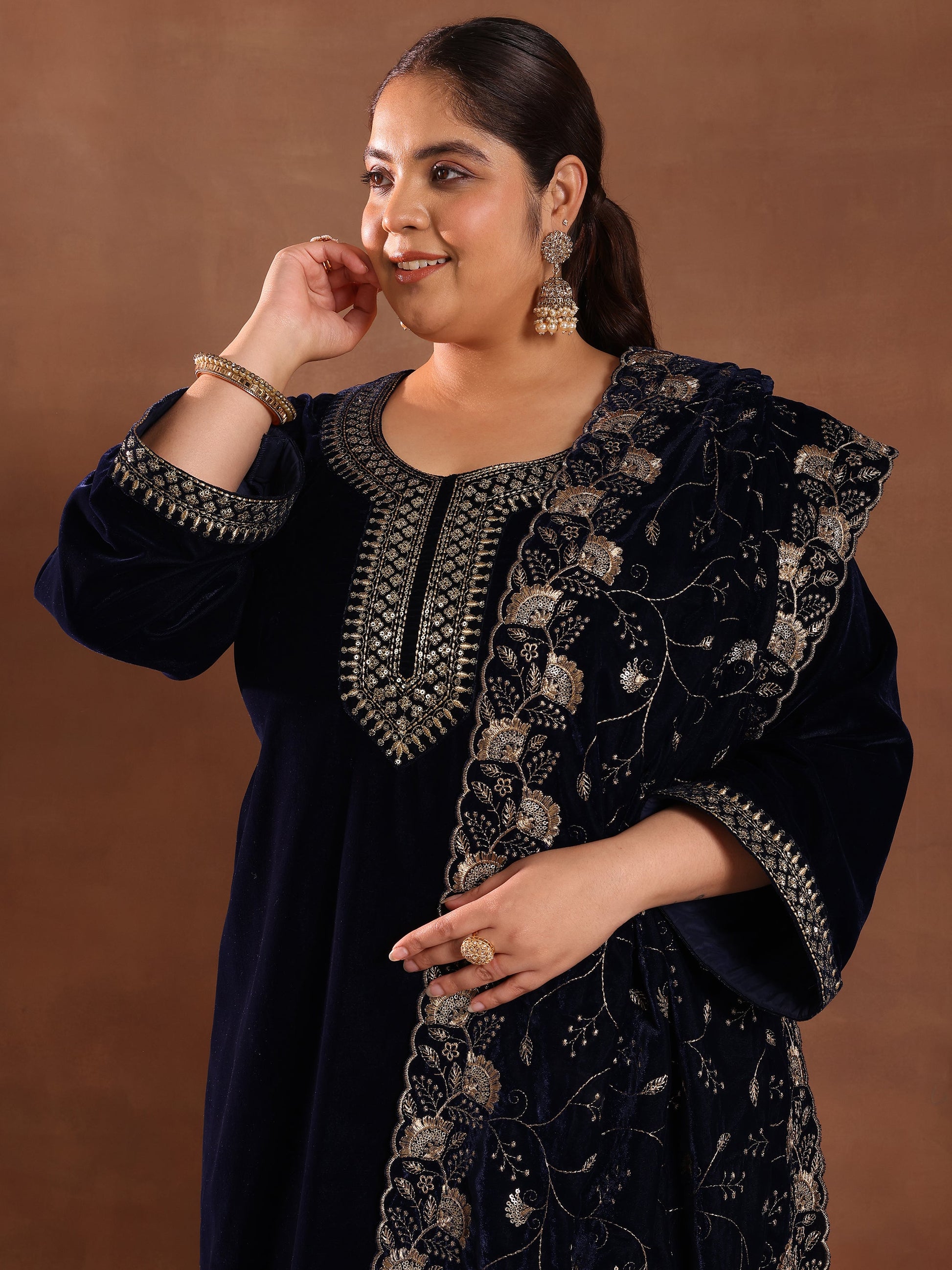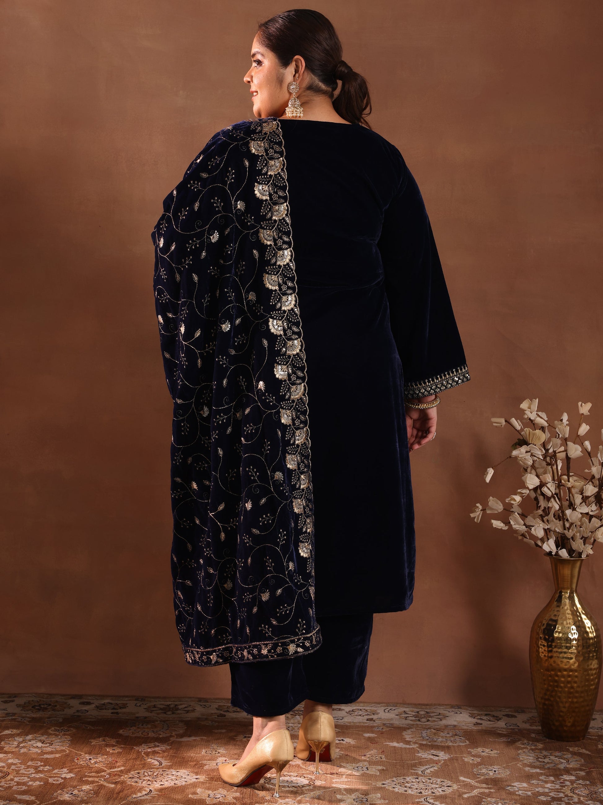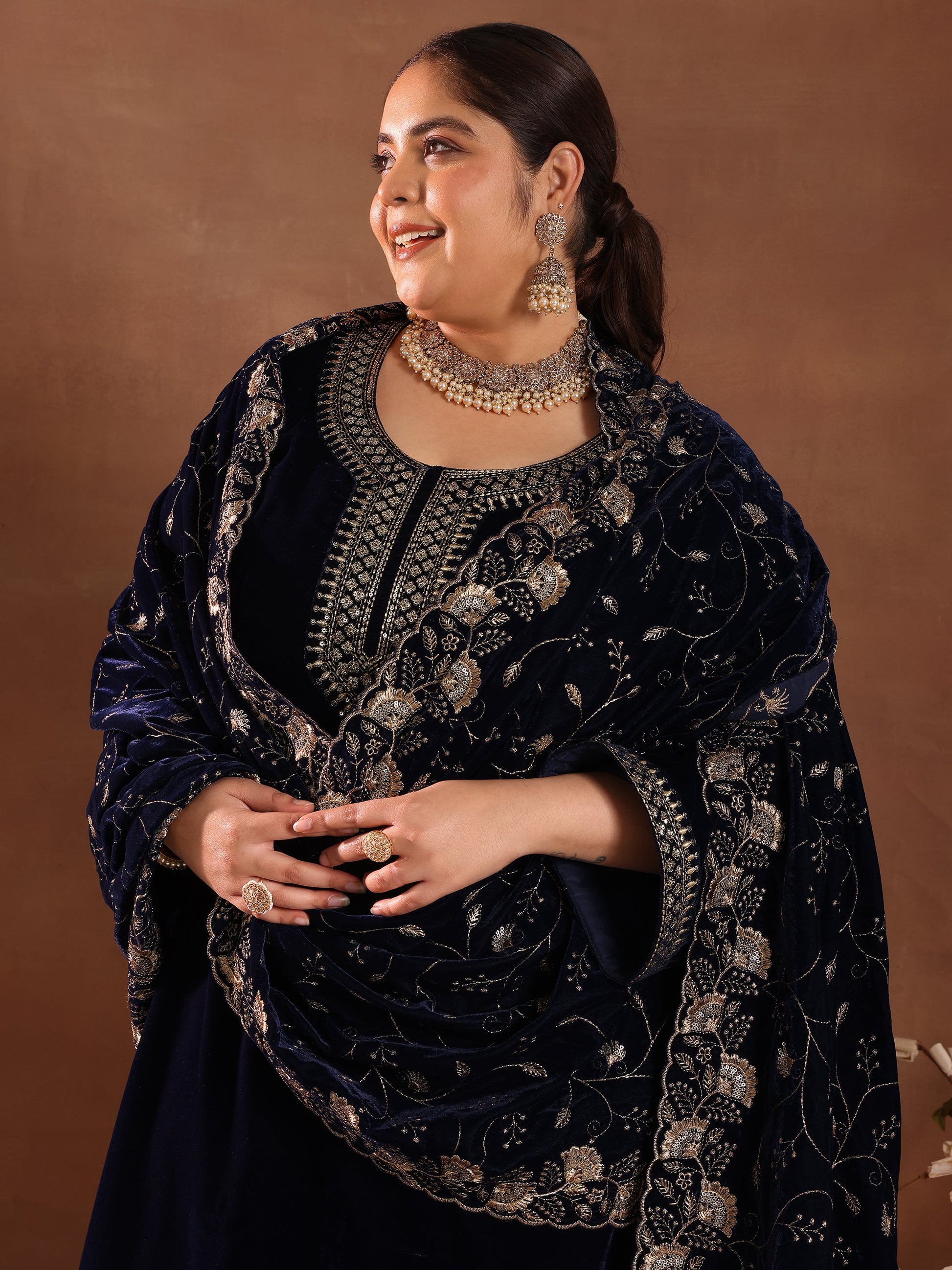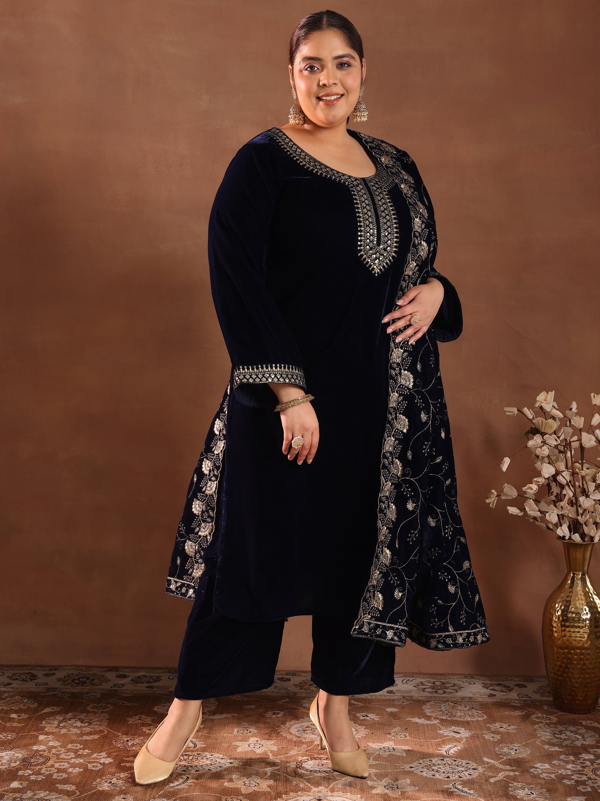 Plus Size Blue Yoke Design Velvet Straight Suit Set With Dupatta