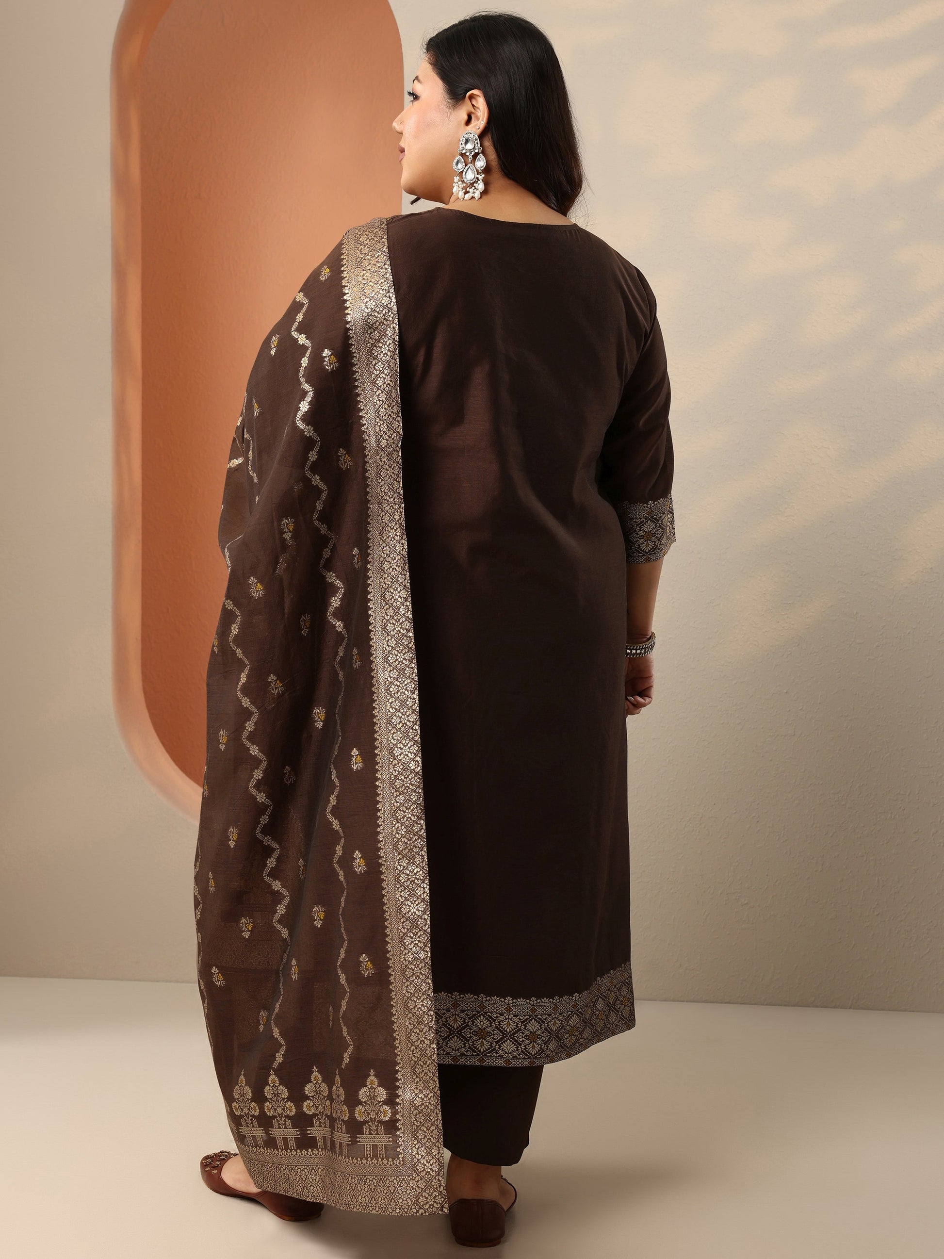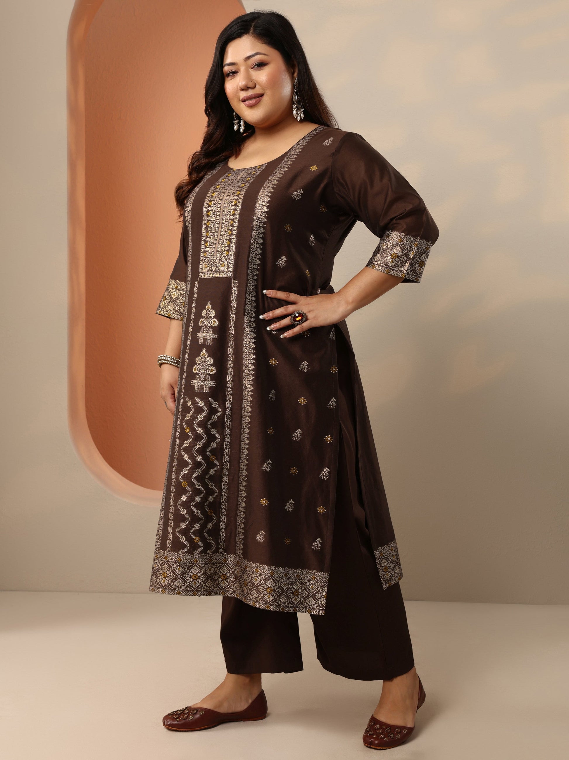Plus Size Brown Woven Design Silk Blend Straight Suit Set With Dupatta