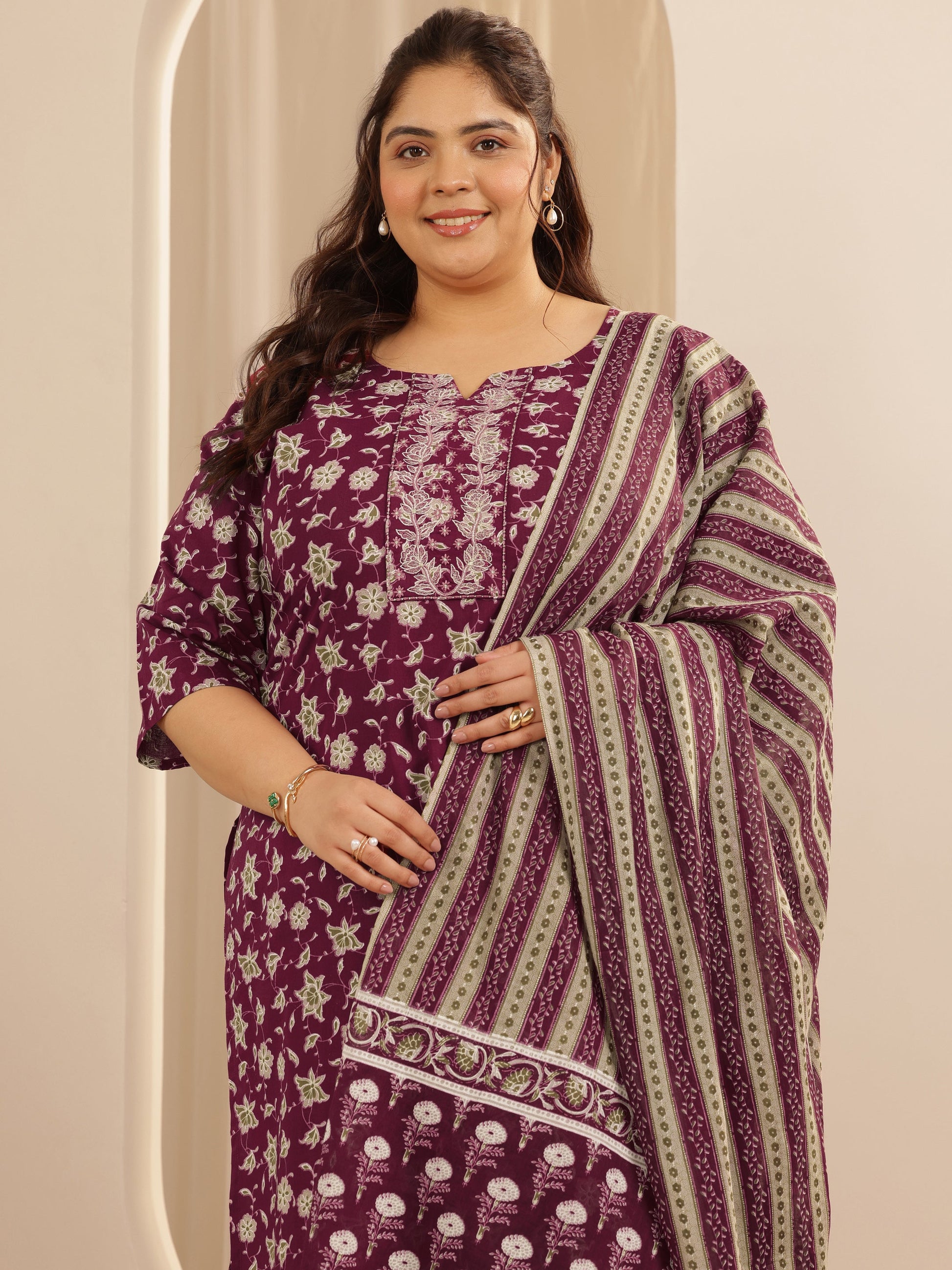 Plus Size Burgundy Printed Cotton Straight Suit Set With Dupatta
