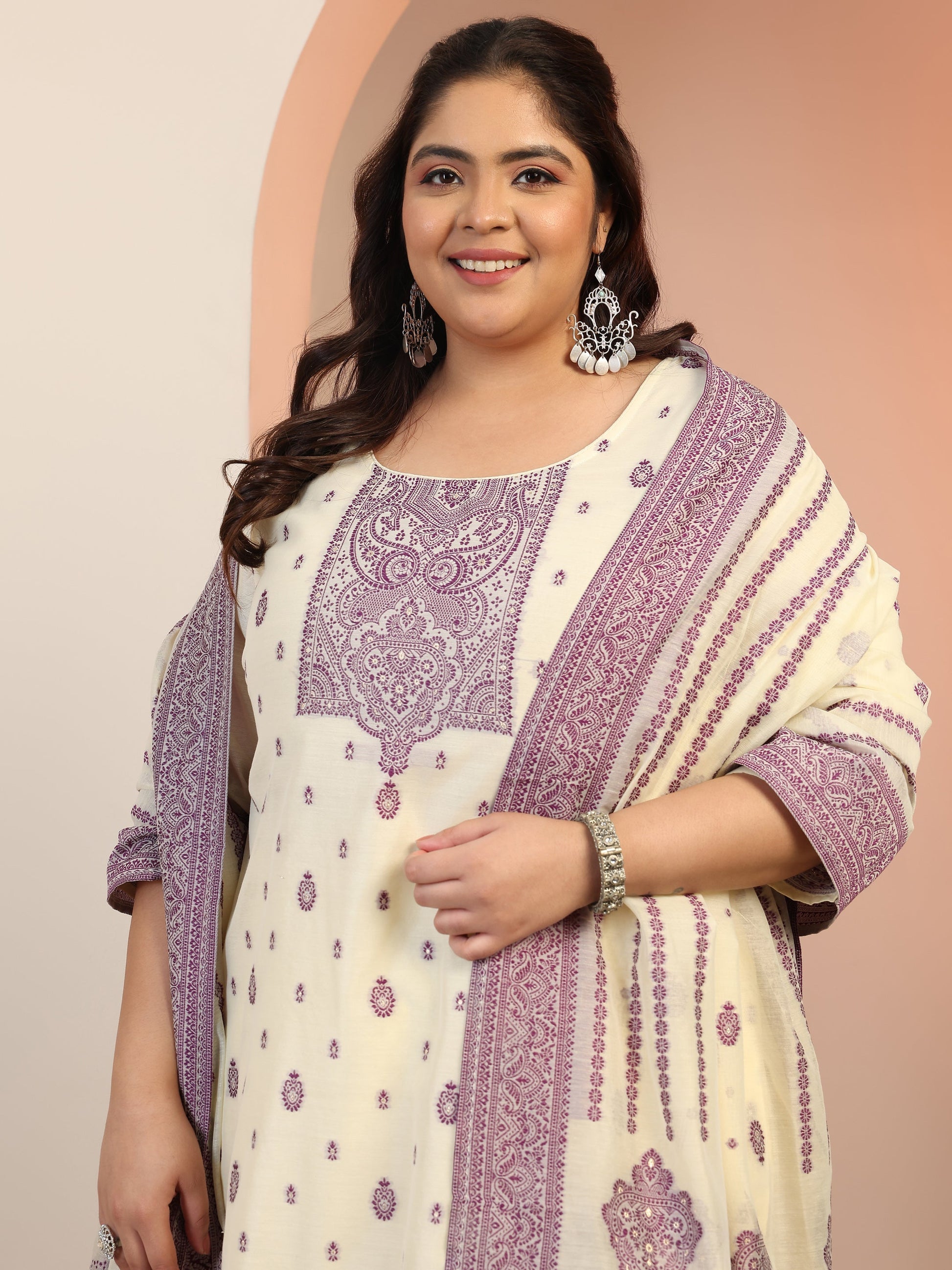 Plus Size Cream Woven Design Cotton Blend Straight Suit Set With Dupatta
