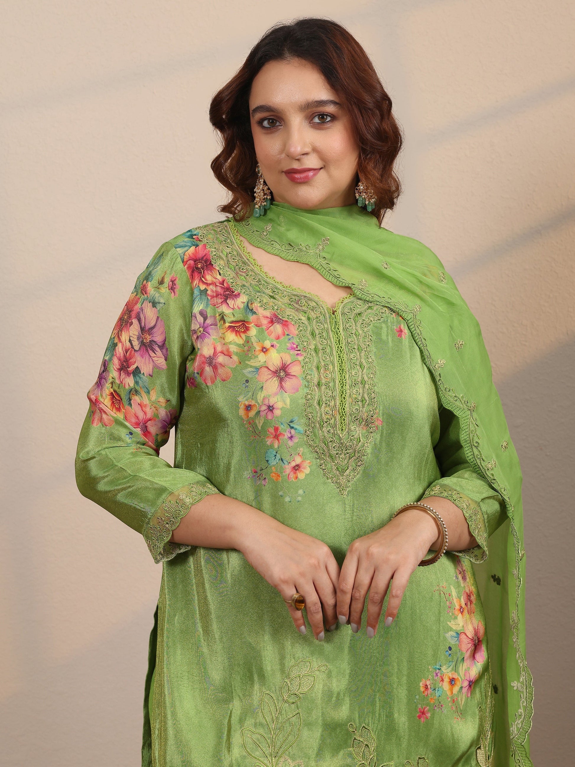 Plus Size Green Embroidered Crepe Straight Suit Set With Dupatta