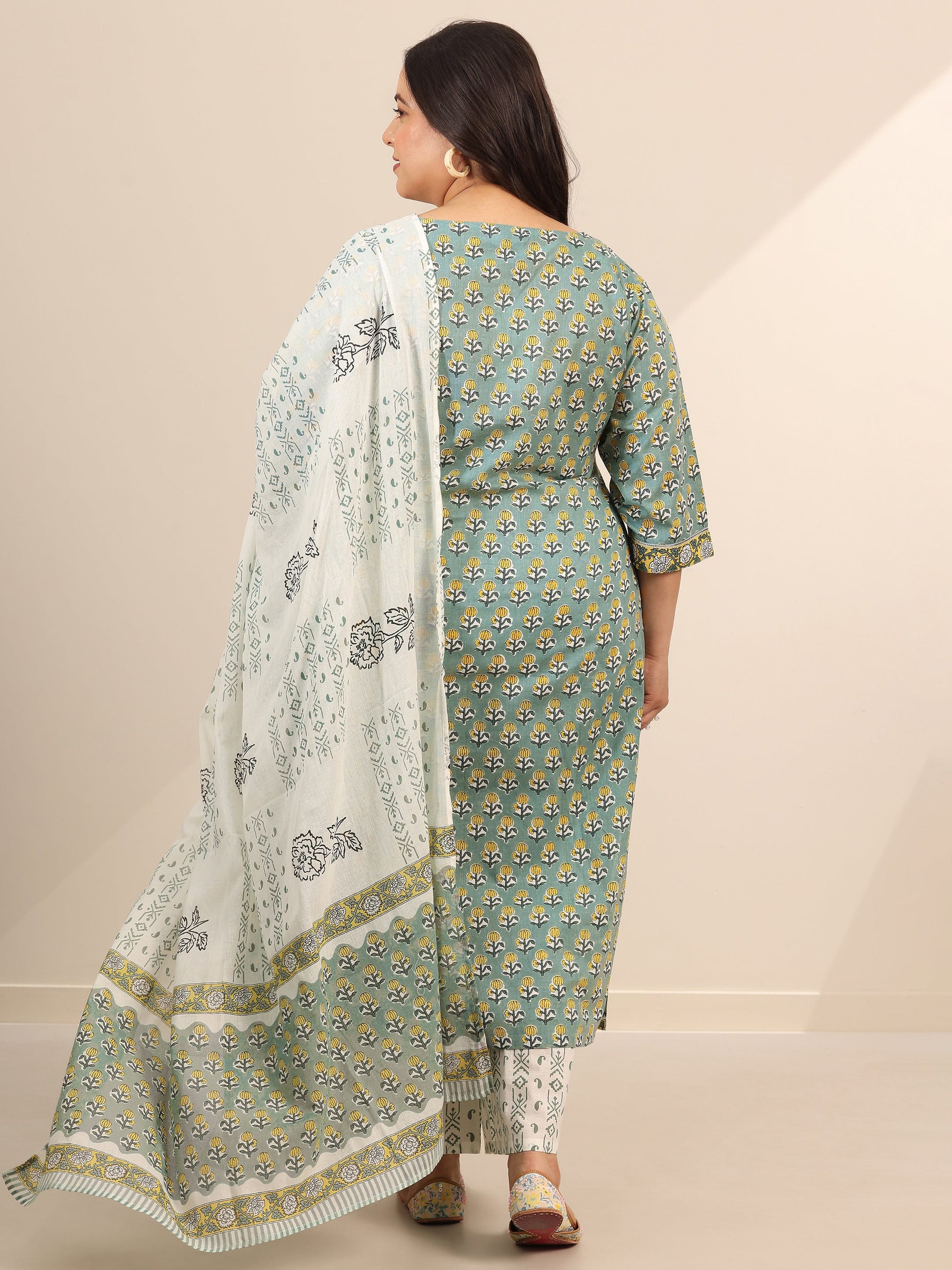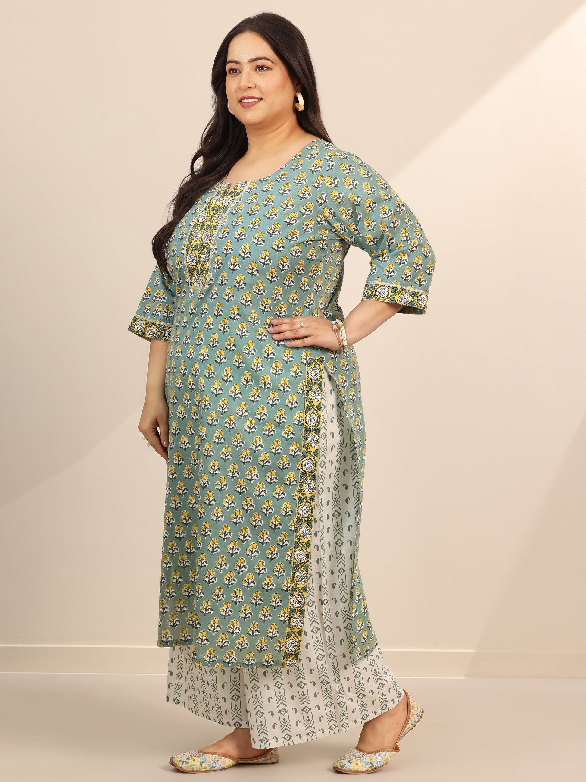 Libas Extra Love collection features our signature designs in comfortable plus sizes. Our 3-piece sea green cotton A-line kurta set features a round neckline, regular sleeves, and a statement yoke. Complemented with straight palazzo pants with an elasticated waistband and 2 pockets, and a printed dupatta. Adorned with floral prints, this style is perfect for casual occasions.