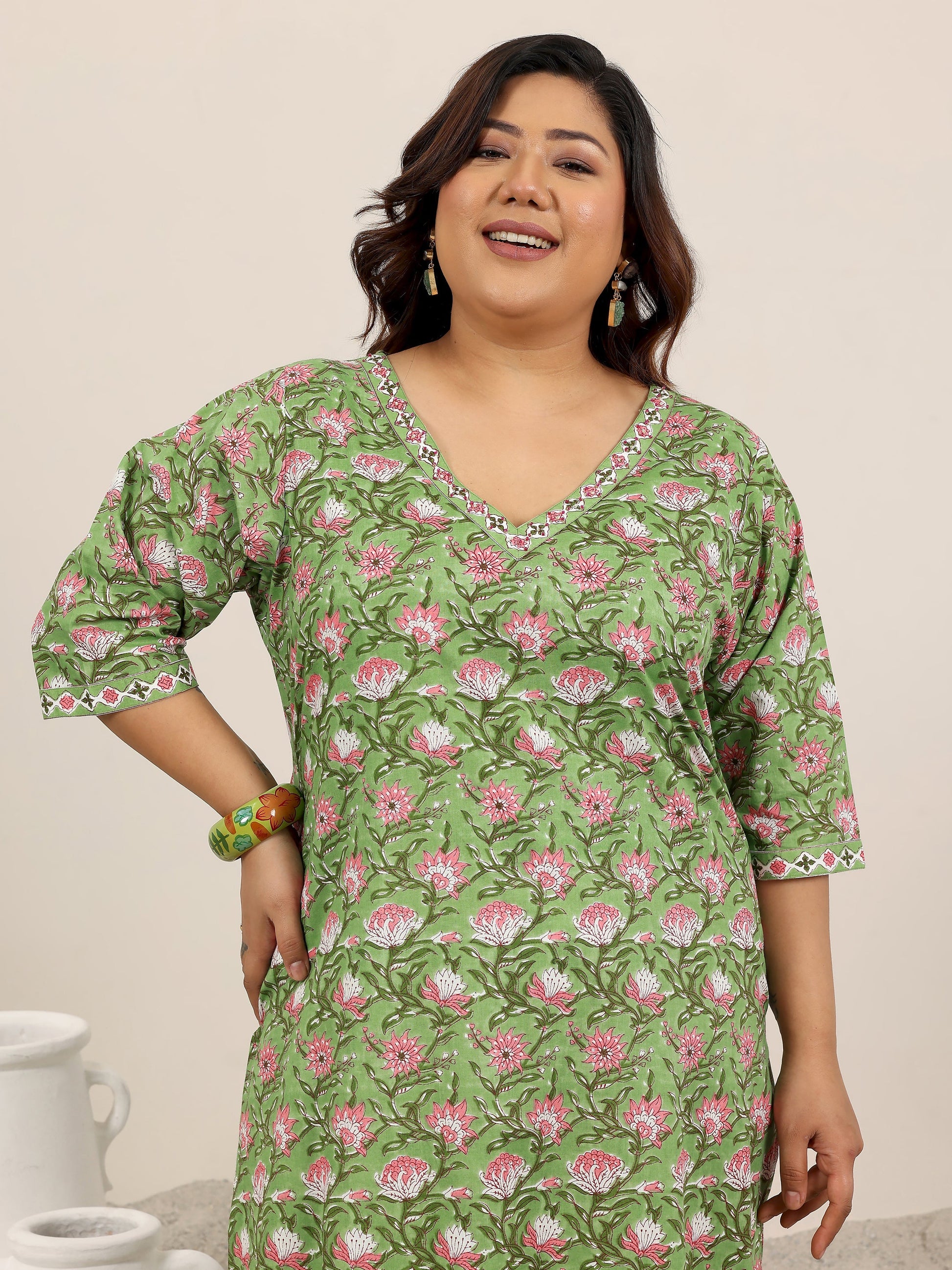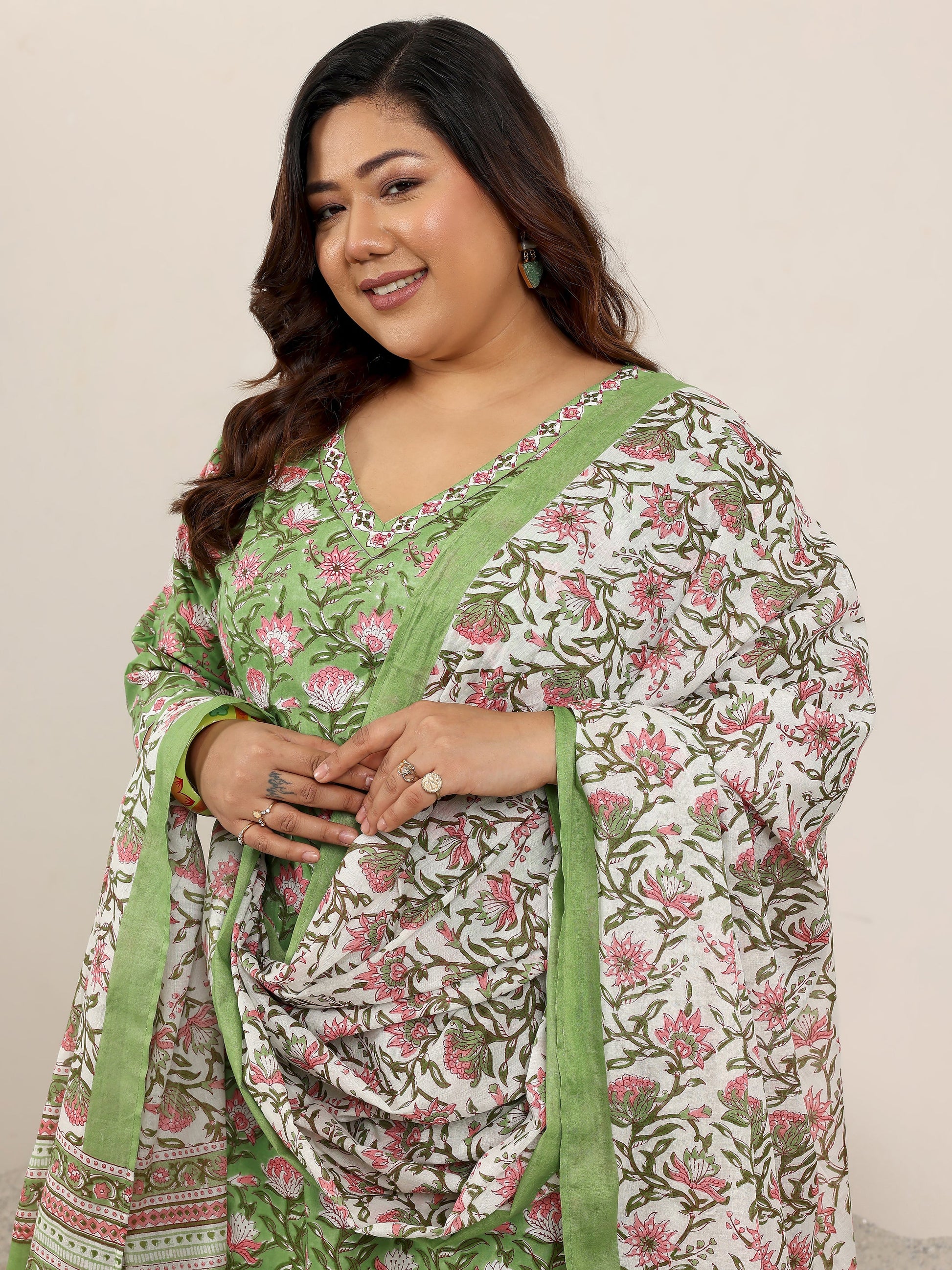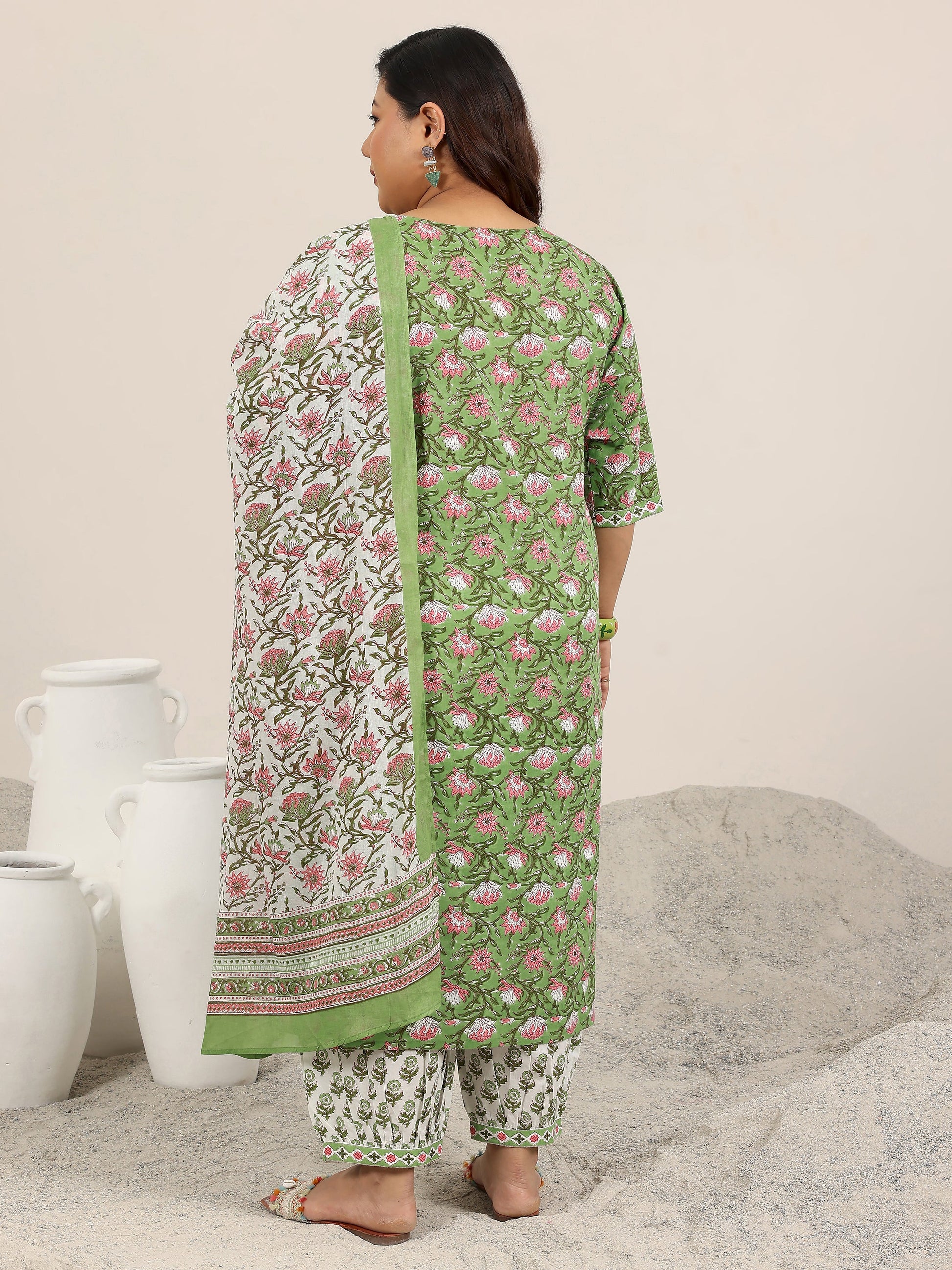 Plus Size Green Printed Cotton Straight Suit Set With Dupatta
