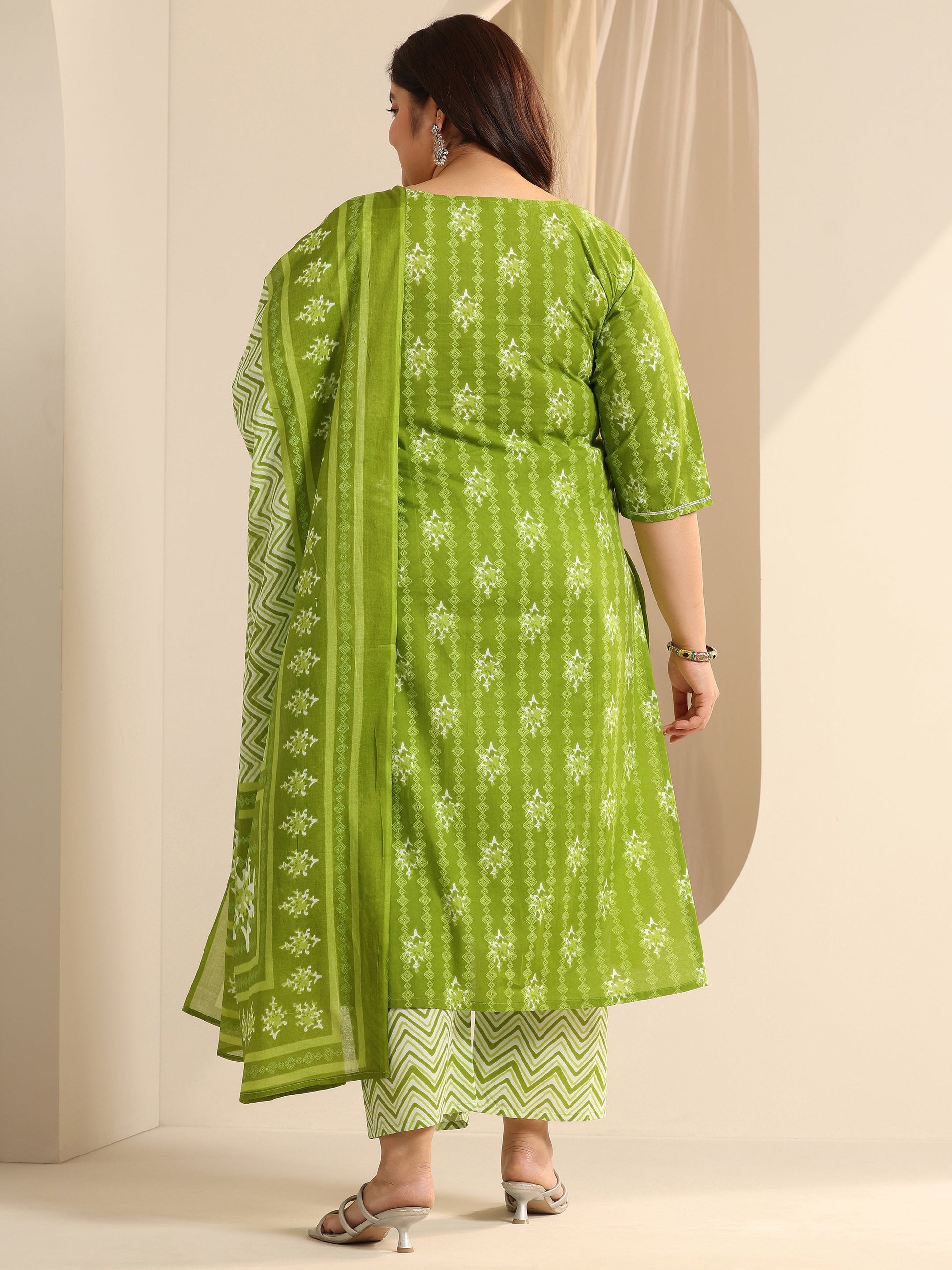 Plus Size Green Printed Cotton Straight Suit Set With Dupatta