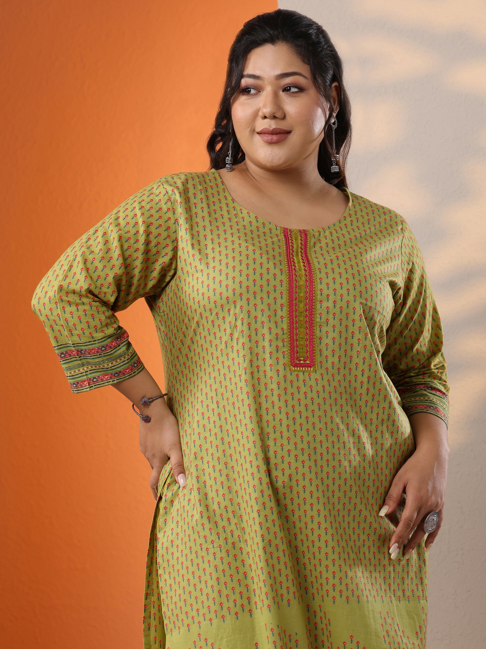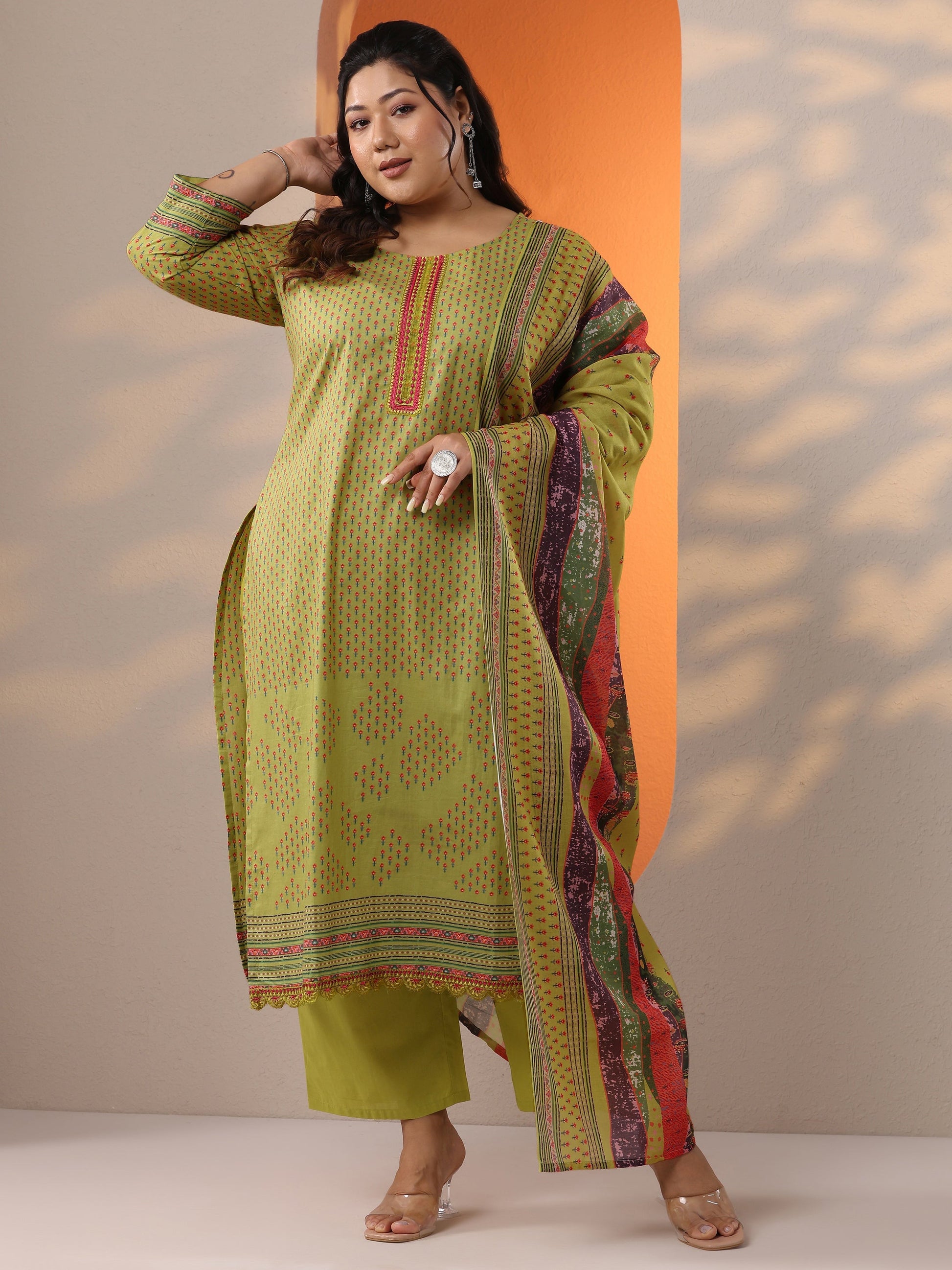 Plus Size Green Printed Cotton Straight Suit Set With Dupatta