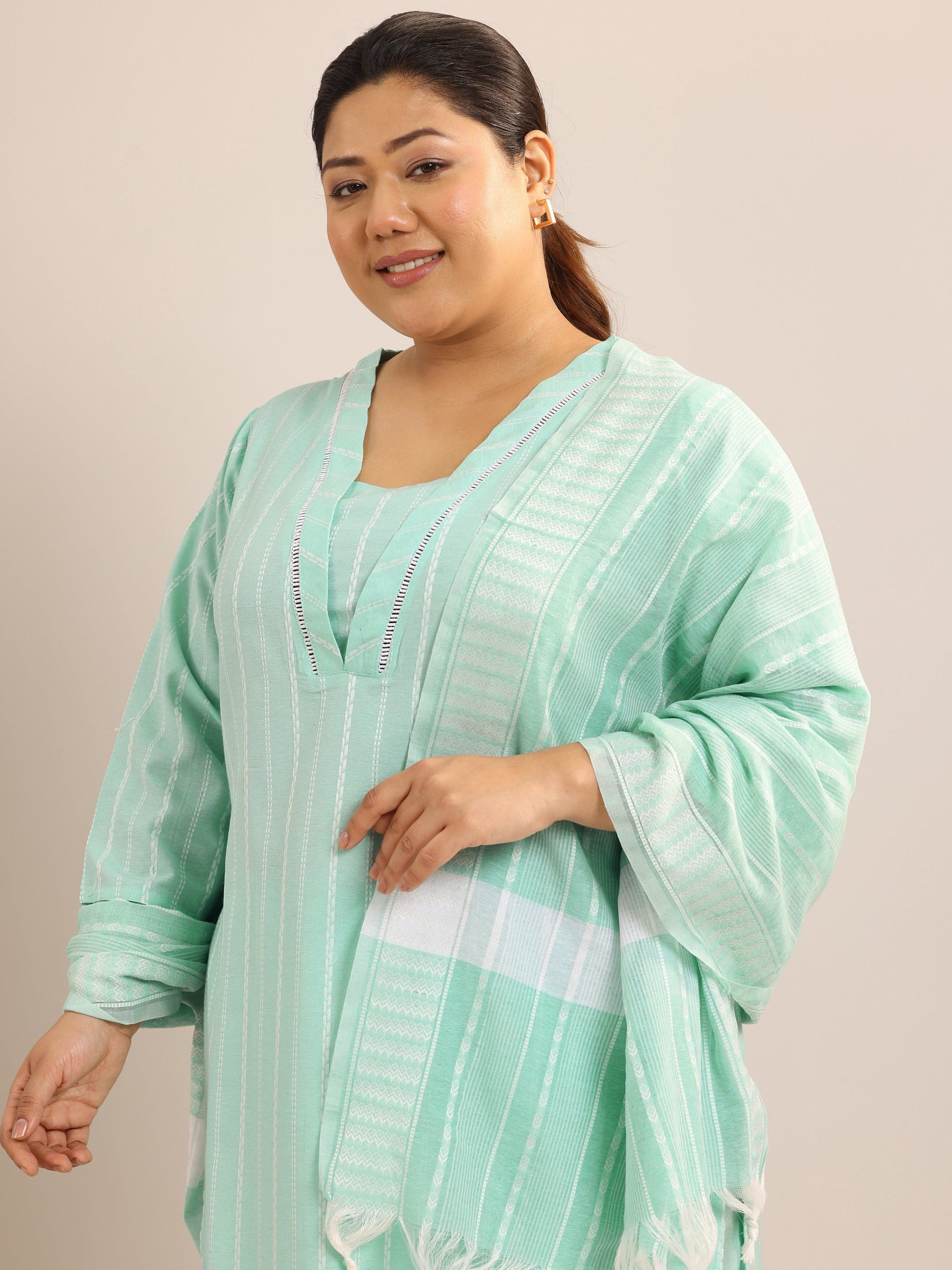 Plus Size Green Self Design Cotton Blend Straight Suit Set With Dupatta