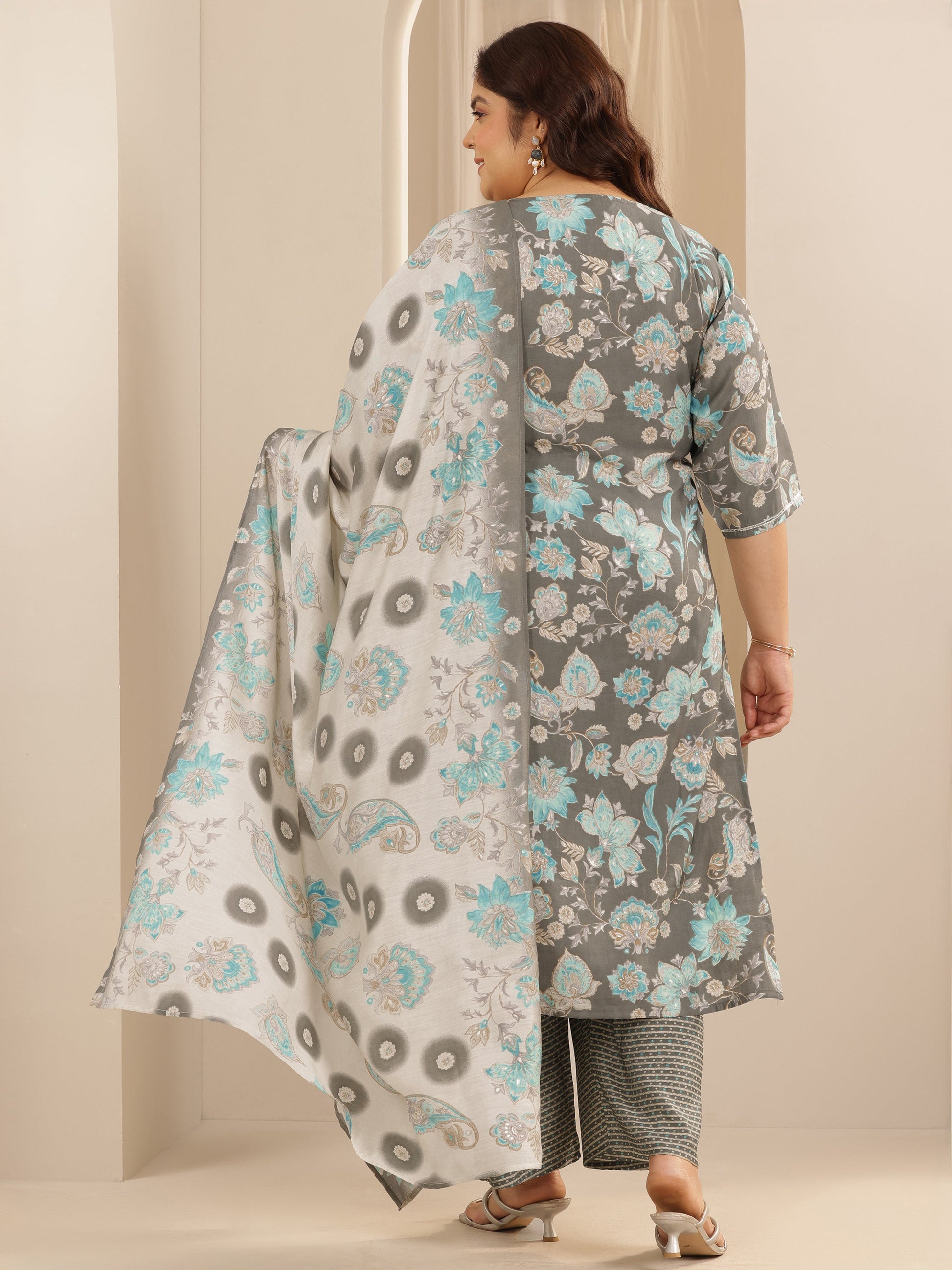 Plus Size Grey Printed Silk blend Straight Suit Set With Dupatta