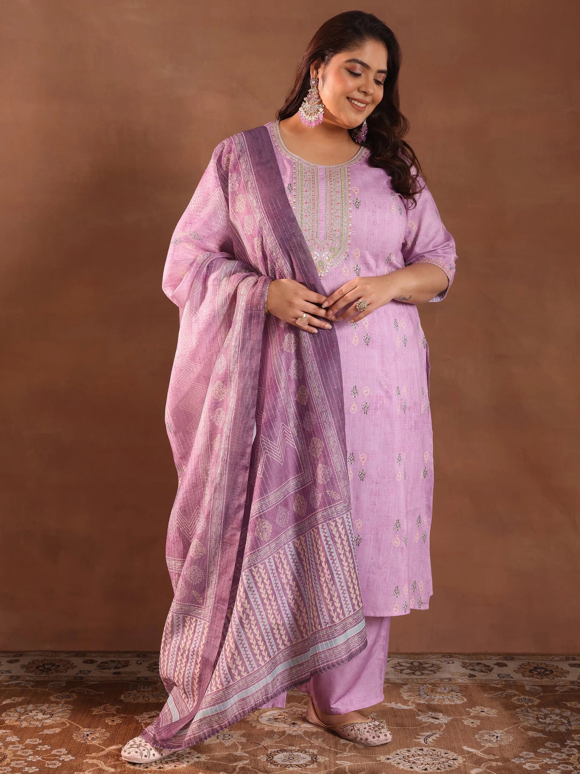 Libas Extra Love collection features our signature designs in comfortable plus sizes. Our 3-piece Lavender Silk Blend Straight-fit Kurta Set features a Round Neckline, Regular Sleeves, and statement yoke. Complemented with Straight Pants with an Elasticated waistband and 2 pockets, and a Printed dupatta. Adorned with Embroidered accents, this style is perfect for Semi Festive occasions.