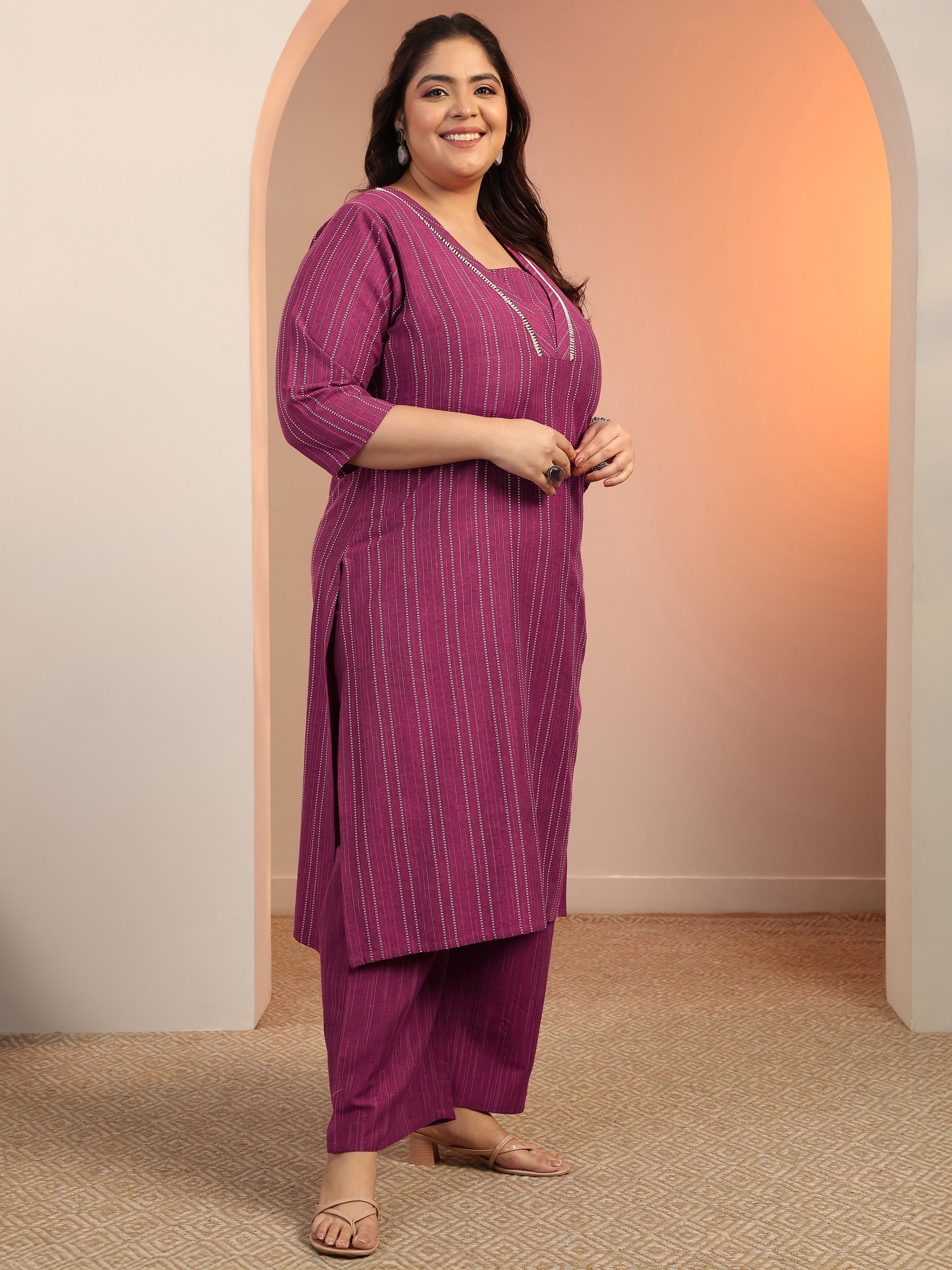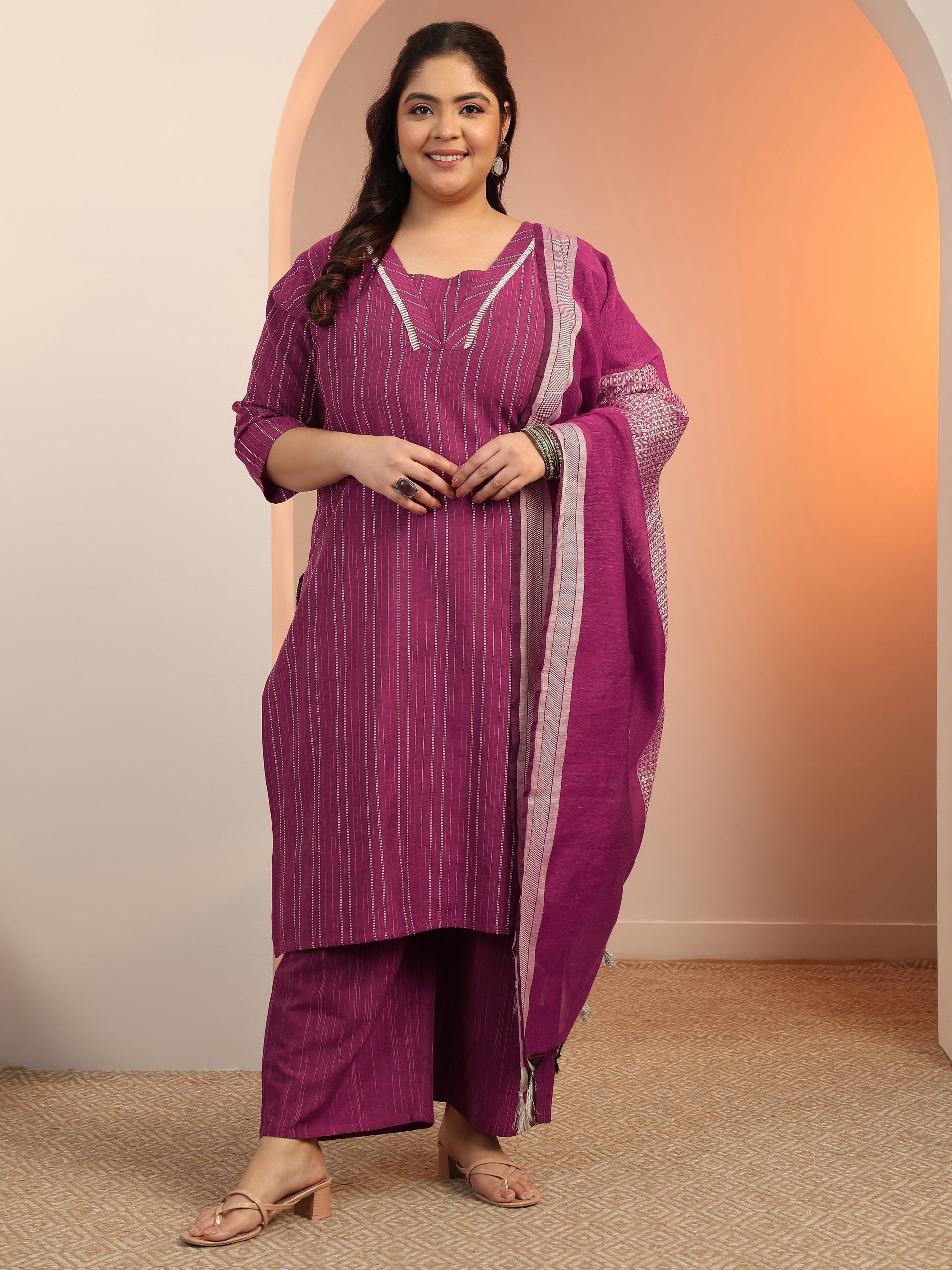Plus Size Magenta Pink Woven Design cotton blend Straight Suit Set With Dupatta