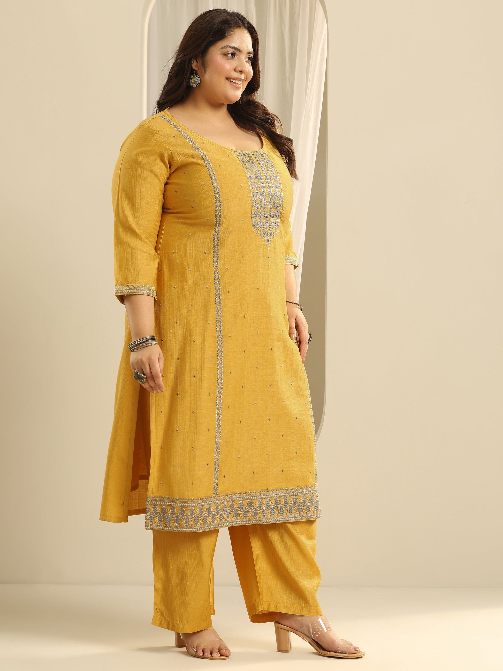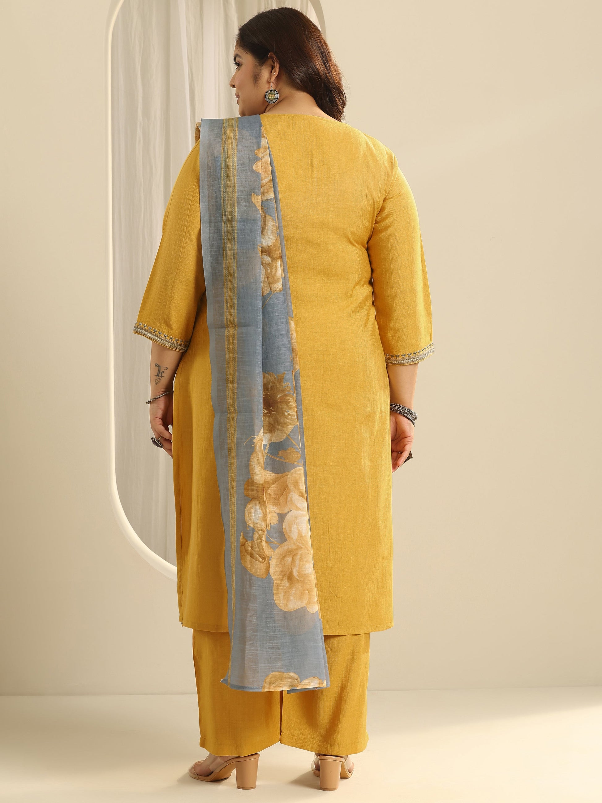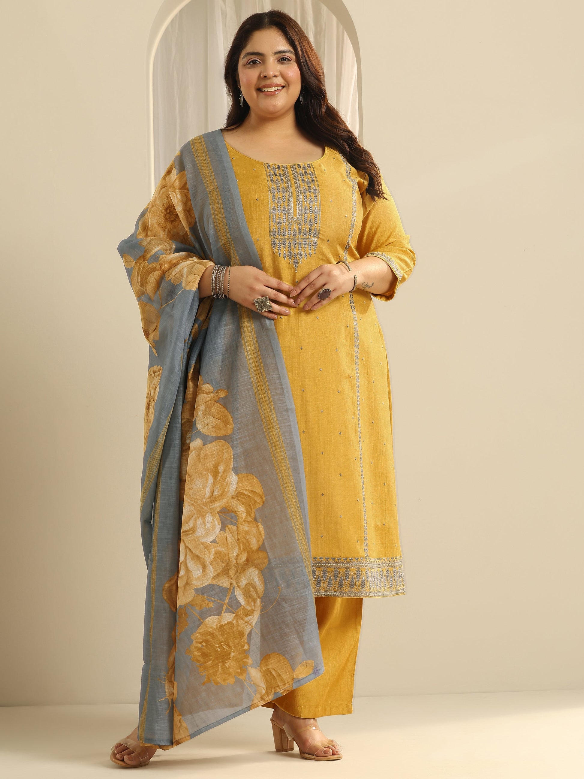 Plus Size Mustard Printed cotton blend Straight Suit Set With Dupatta