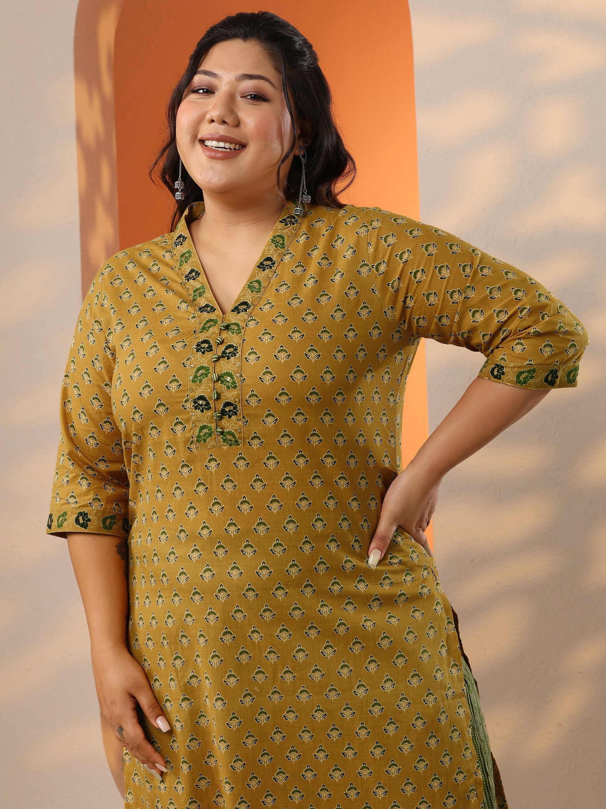 Plus Size Mustard Printed Cotton Straight Suit Set With Dupatta