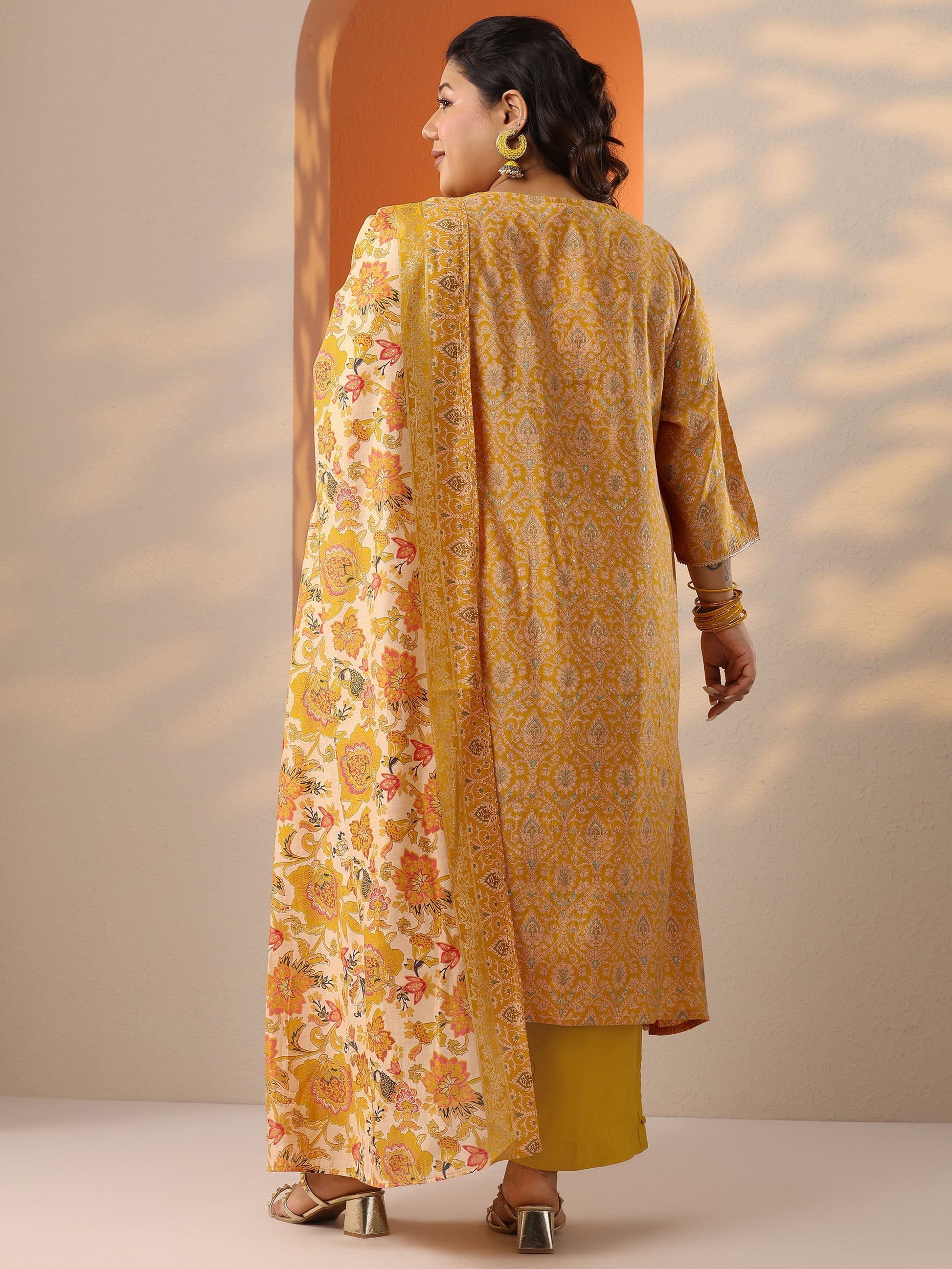 Plus Size Mustard Printed Silk Blend Straight Suit Set With Dupatta