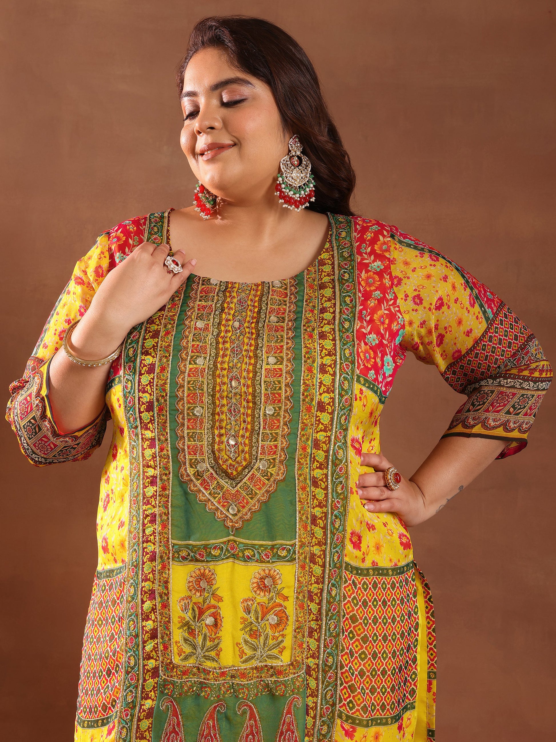 Libas Extra Love collection features our signature designs in comfortable plus sizes. Our 3-piece yellow organza straight-fit kurta set features a V-neckline, regular sleeves, and statement yoke. Complemented with straight pants with an elasticated waistband and 1 pocket, and a printed dupatta. Adorned with printed embellishments, this style is perfect for semi festive occasions.