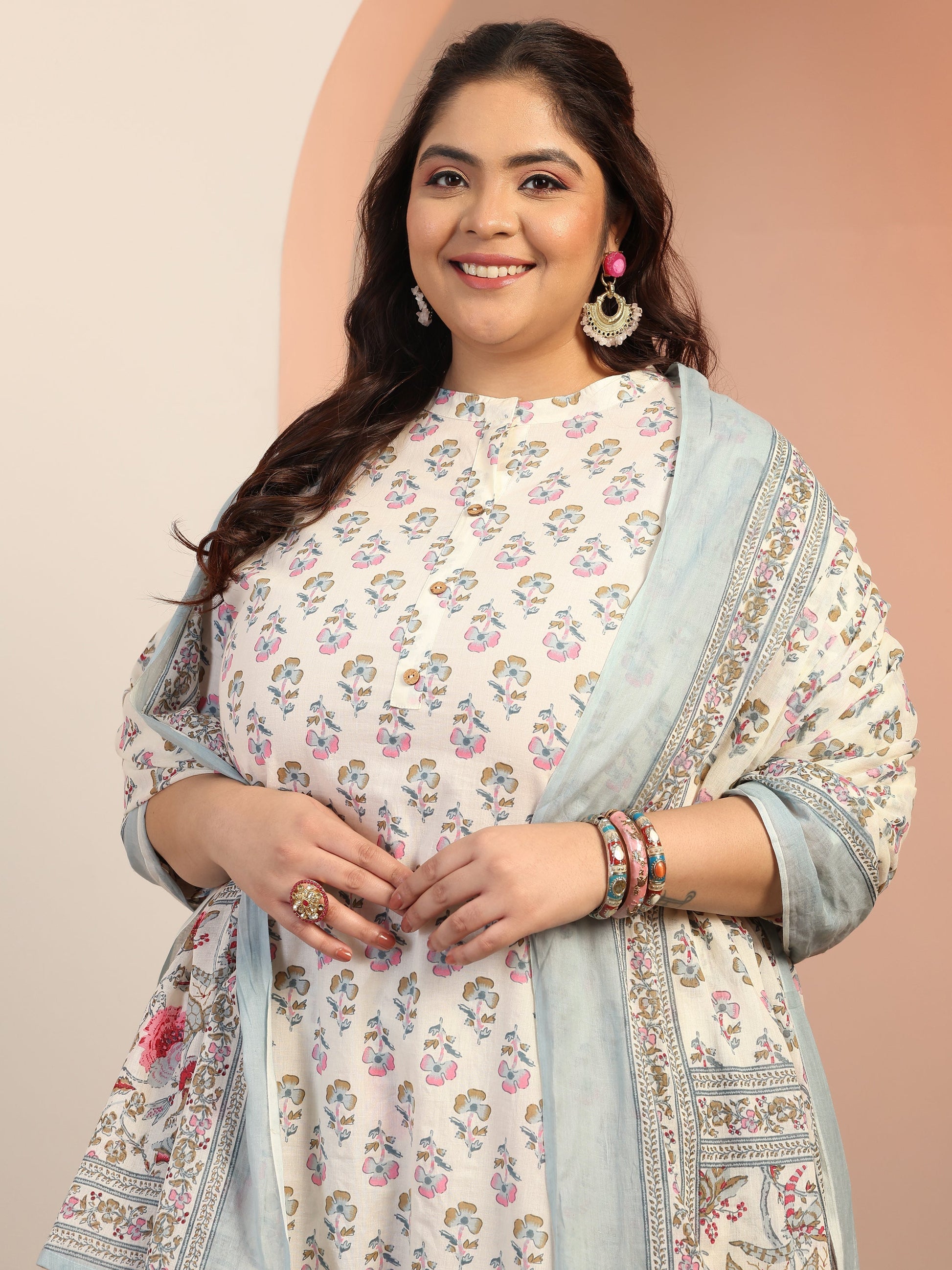 Plus Size Off white Floral Printed Cotton Straight Suit Set With Dupatta