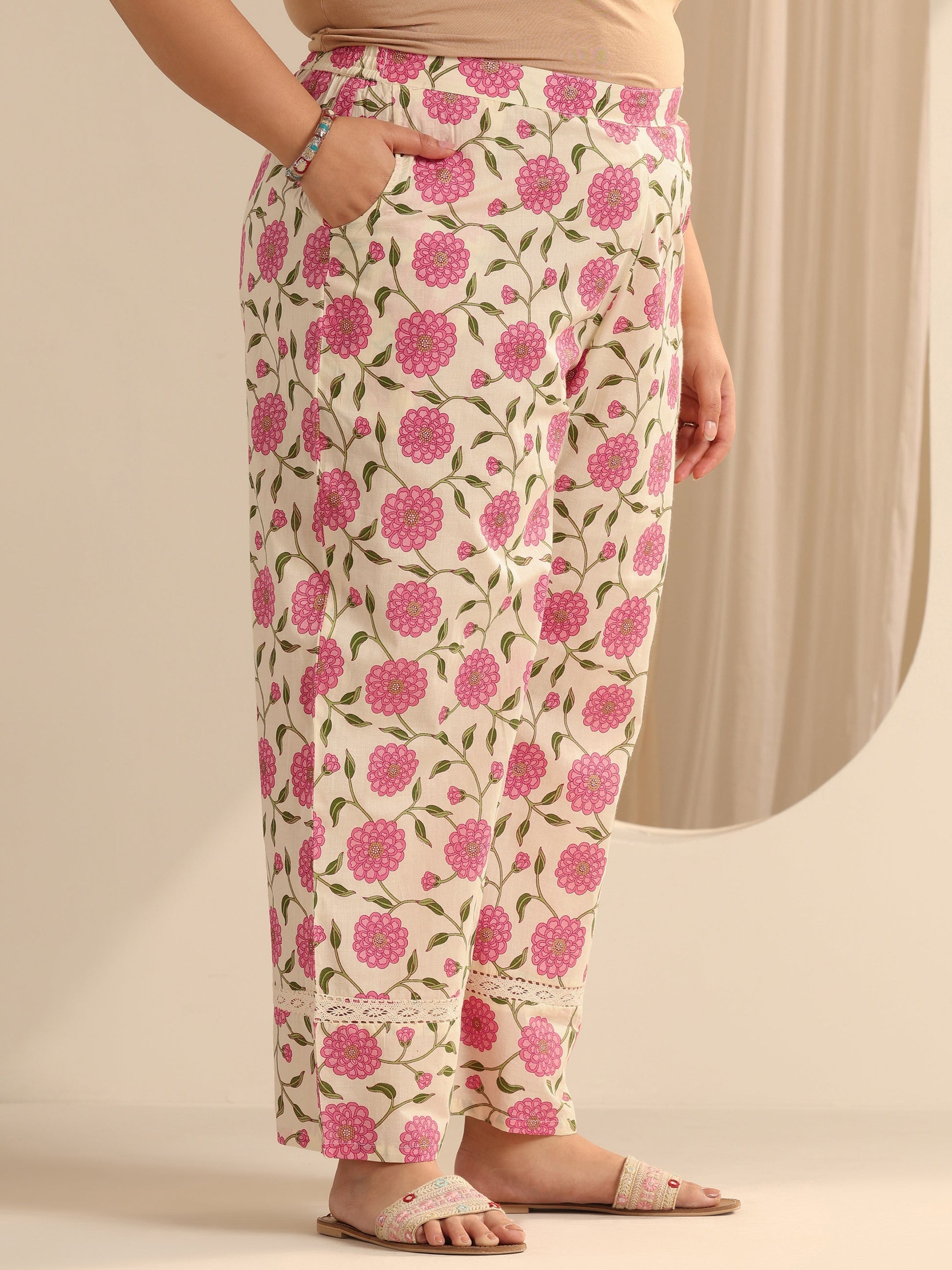Plus Size Off White Printed Cotton Blend Straight Kurta Set