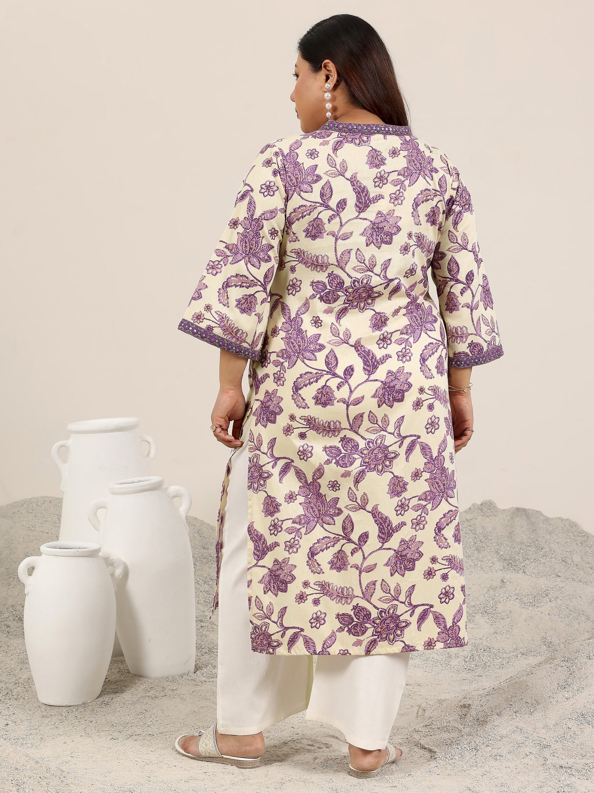 Libas Extra Love collection features our signature designs in comfortable plus sizes. Our purple rayon printed straight kurta features a classic V-neckline and three-quarter sleeves. Highlighted with ethnic prints, roomy pockets, and charming sequins, this style is perfect for light festivities.