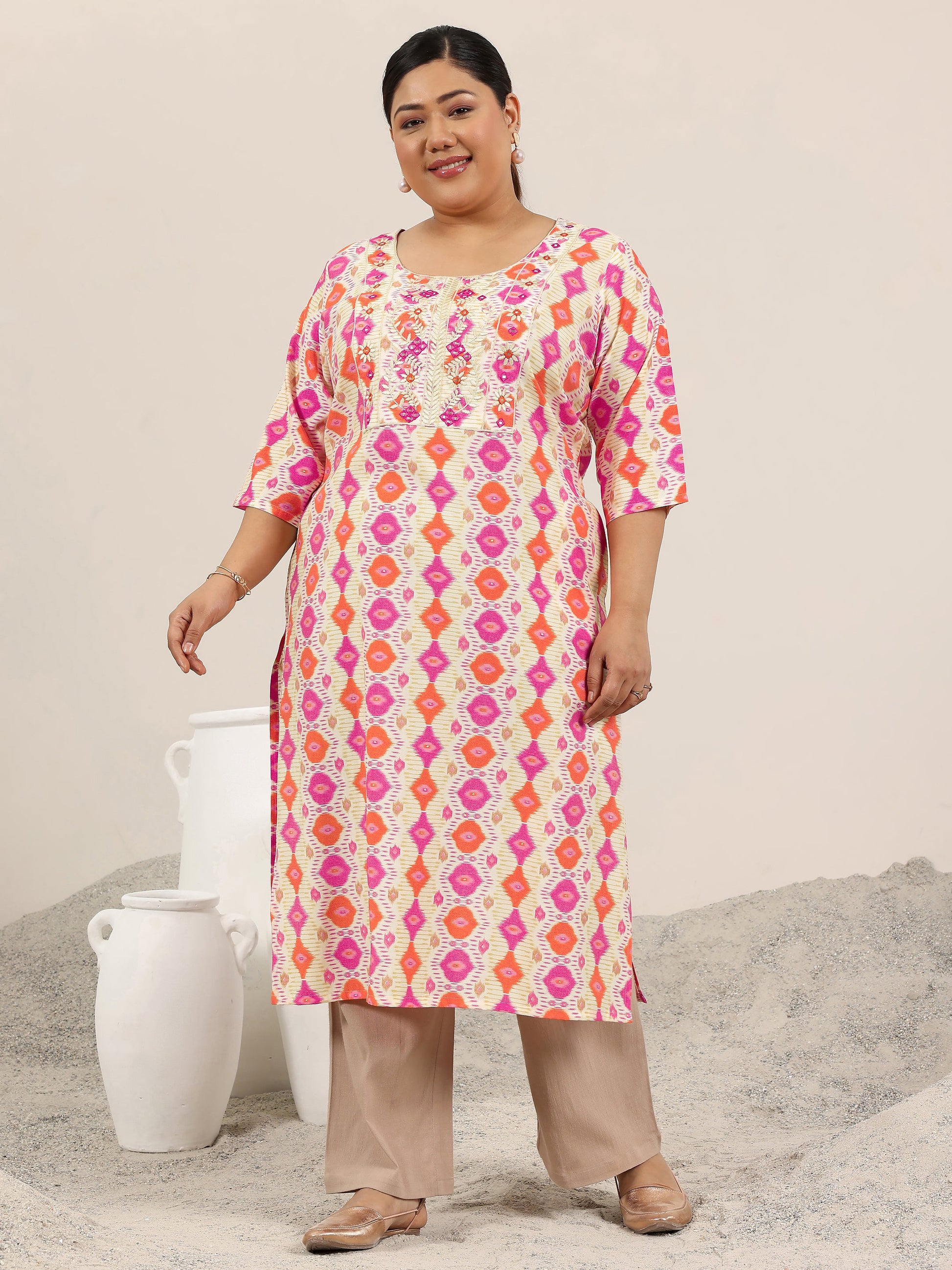 Libas Extra Love collection features our signature designs in comfortable plus sizes. Our off white silk printed straight kurta features a round neckline, three-quarter sleeves, and a statement yoke. Highlighted with block prints and roomy pockets, this style is ideal for light festivities.