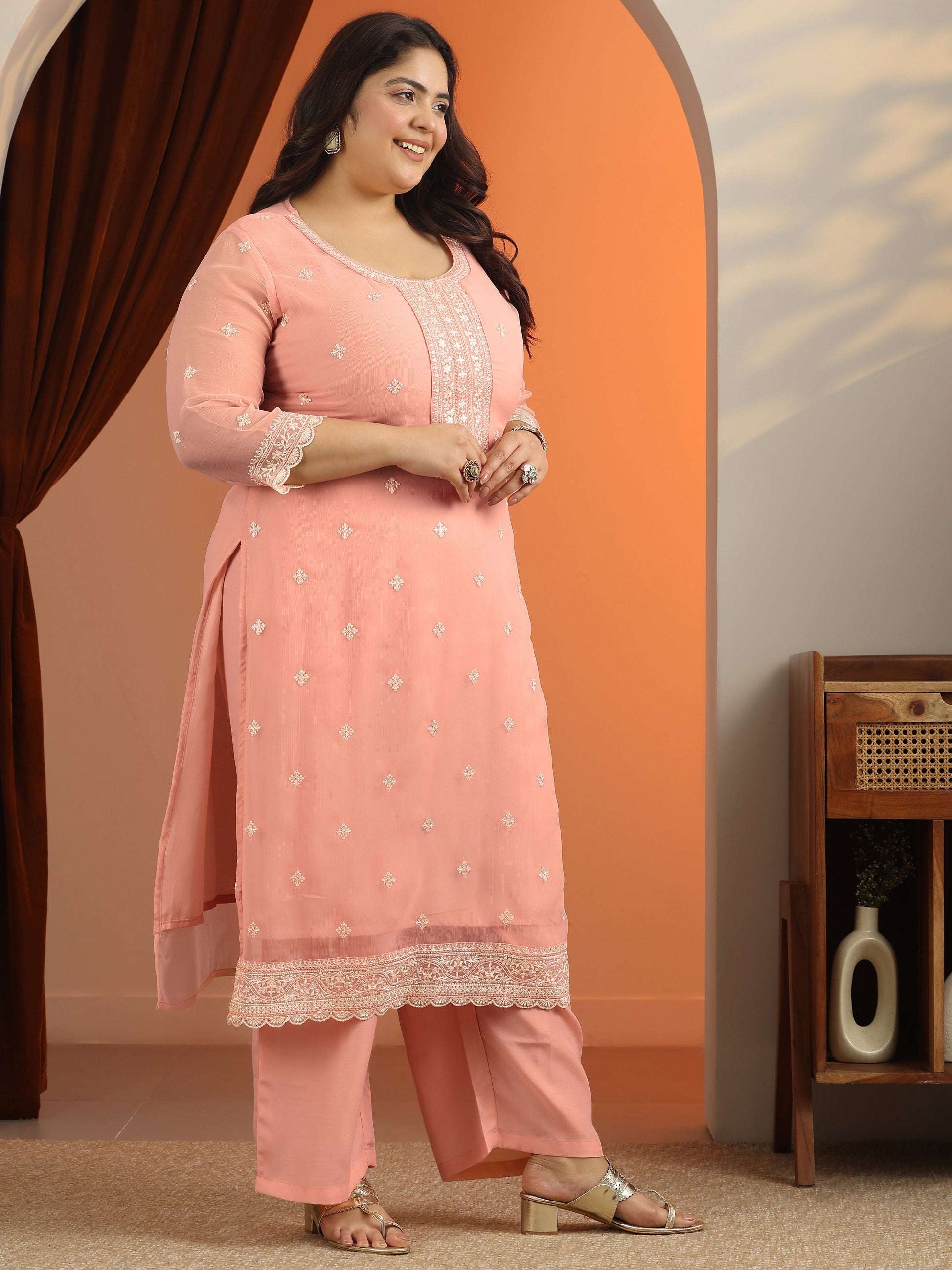 Plus Size Peach Embroidered Chiffon Straight Suit Set With Dupatta