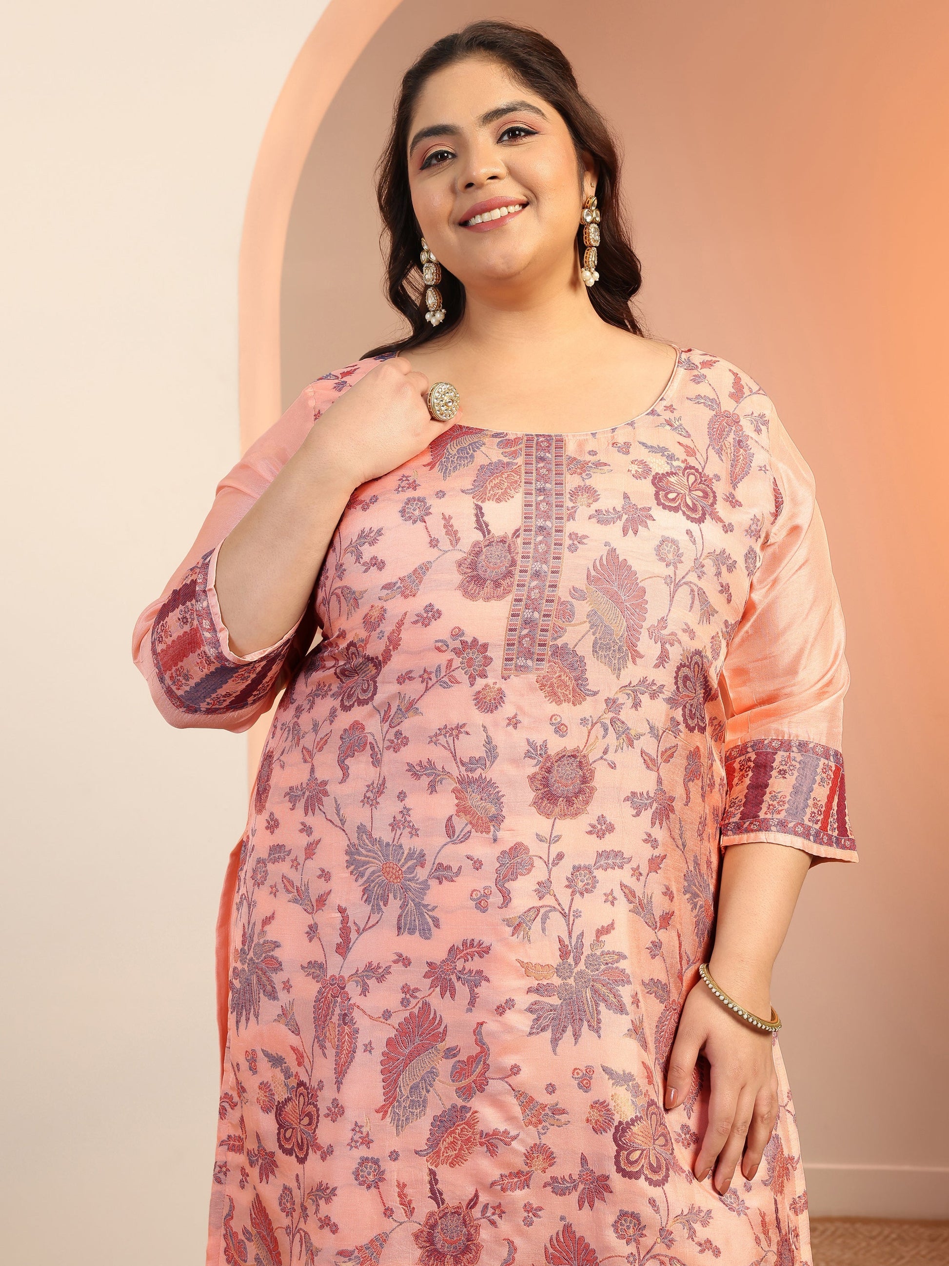 Plus Size Peach Woven Design Silk blend Straight Suit Set With Dupatta