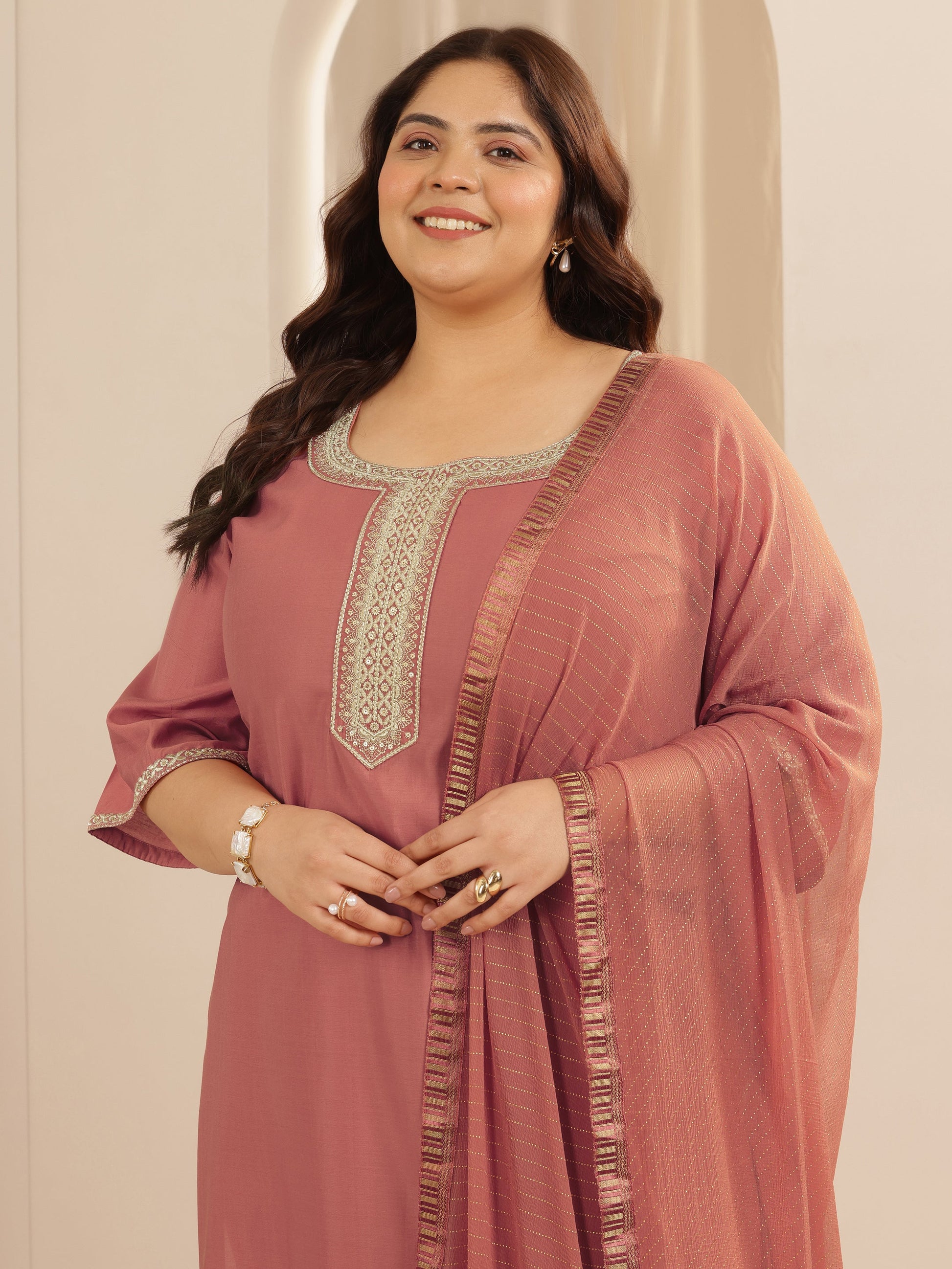 Libas Extra Love collection features Our signature designs in comfortable plus sizes. Our 3-piece Peach Silk Blend Straight-fit Kurta Set features a U-Notched Neckline, Regular Sleeves, and statement yoke. Complemented with Straight Pants with a Partially Elasticated waistband and 2 pockets, and a Self Design dupatta. Adorned with Embroidered accents, this style is perfect for Festive Wear.
