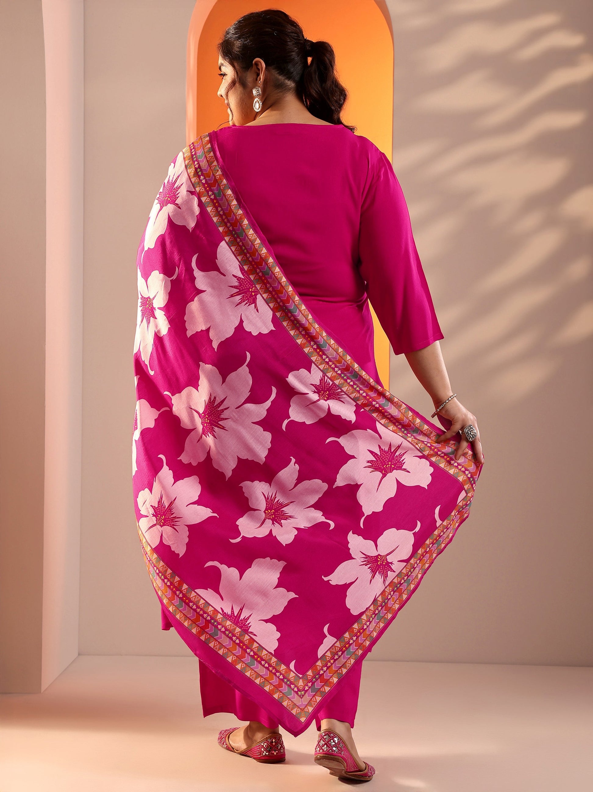 Plus Size Pink Embroidered Viscose Straight Suit Set With Dupatta