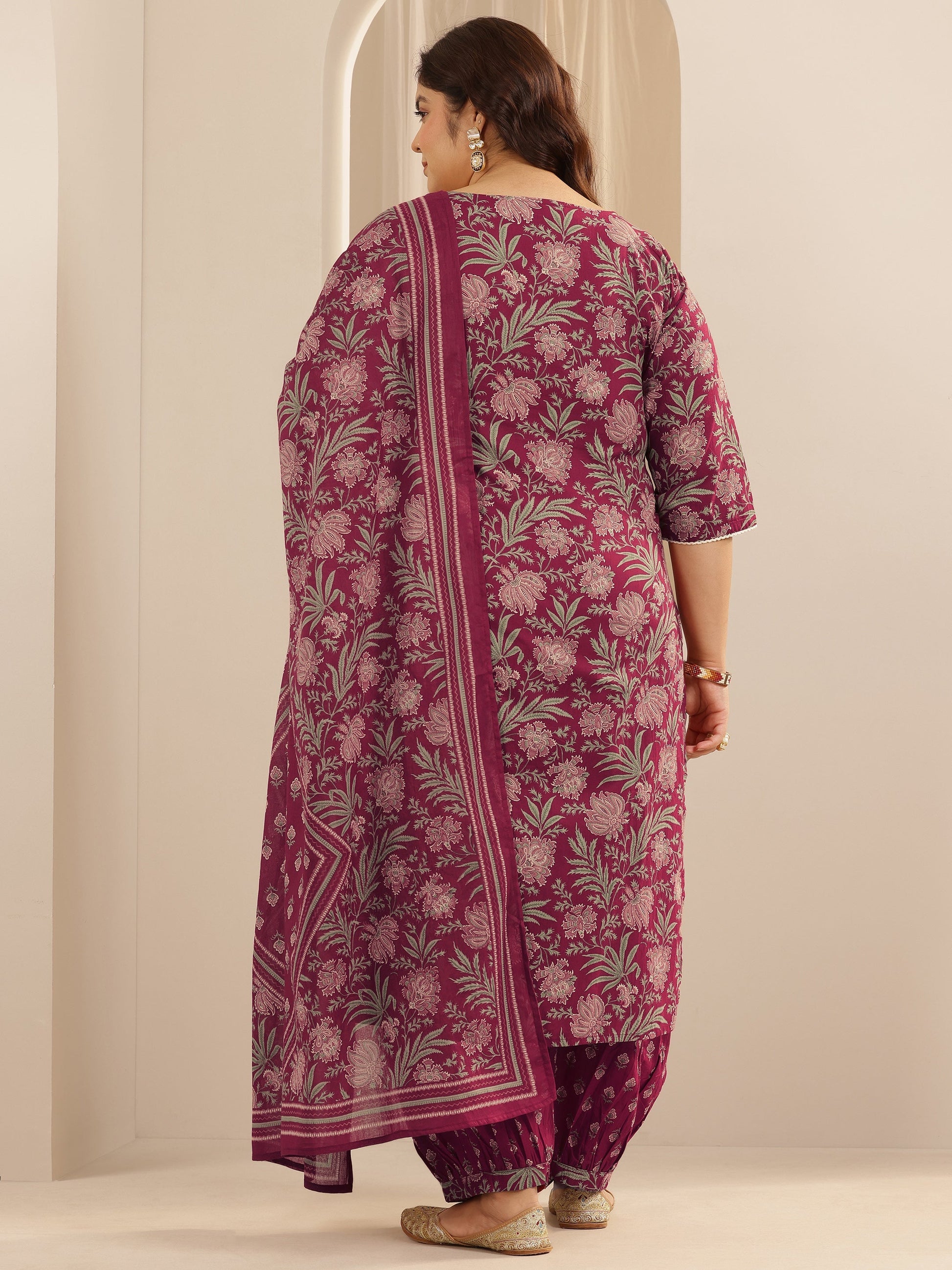 Plus Size Pink Printed Cotton Straight Suit Set With Dupatta