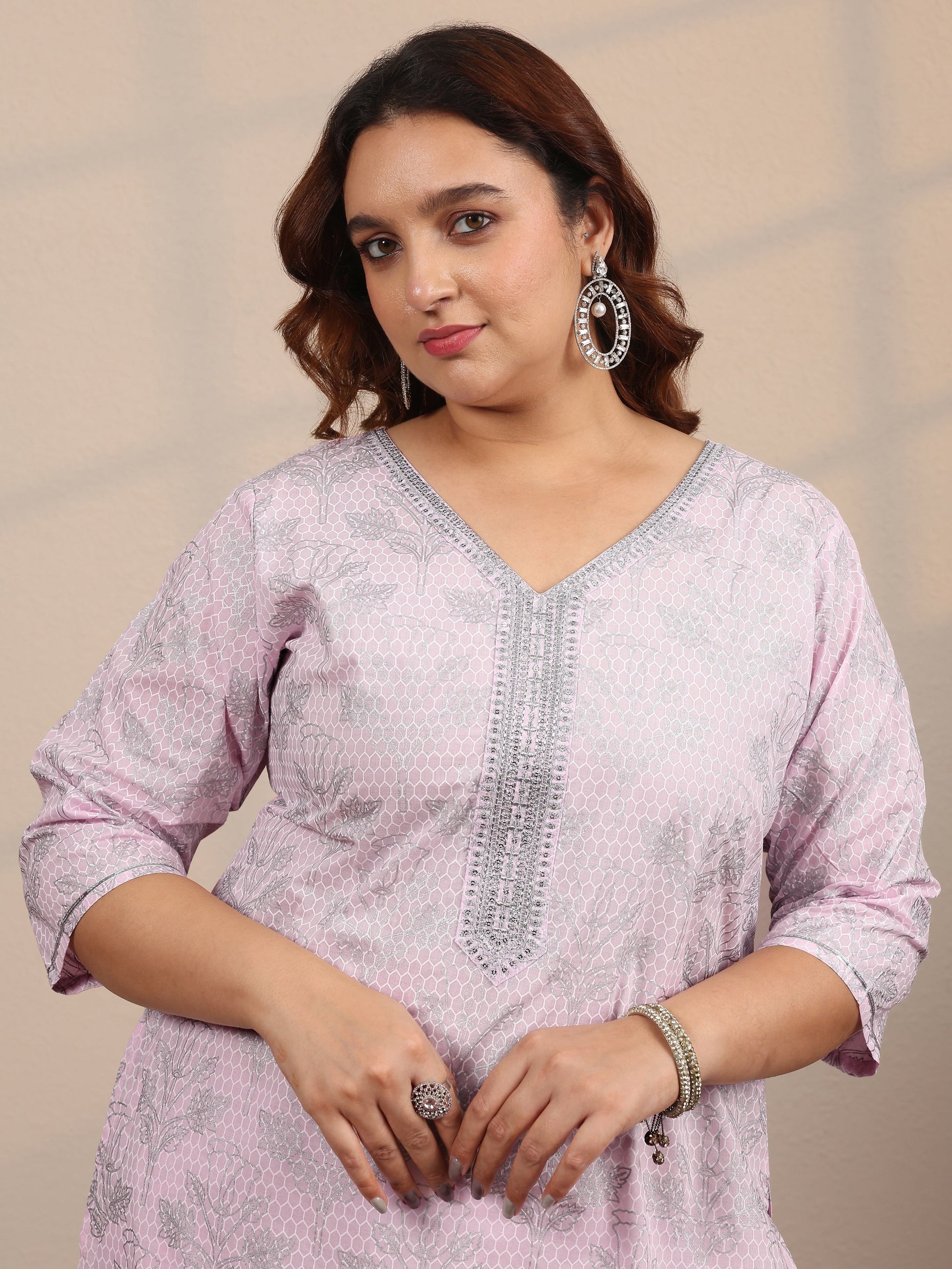 Plus Size Pink Printed Cotton Straight Suit Set With Dupatta