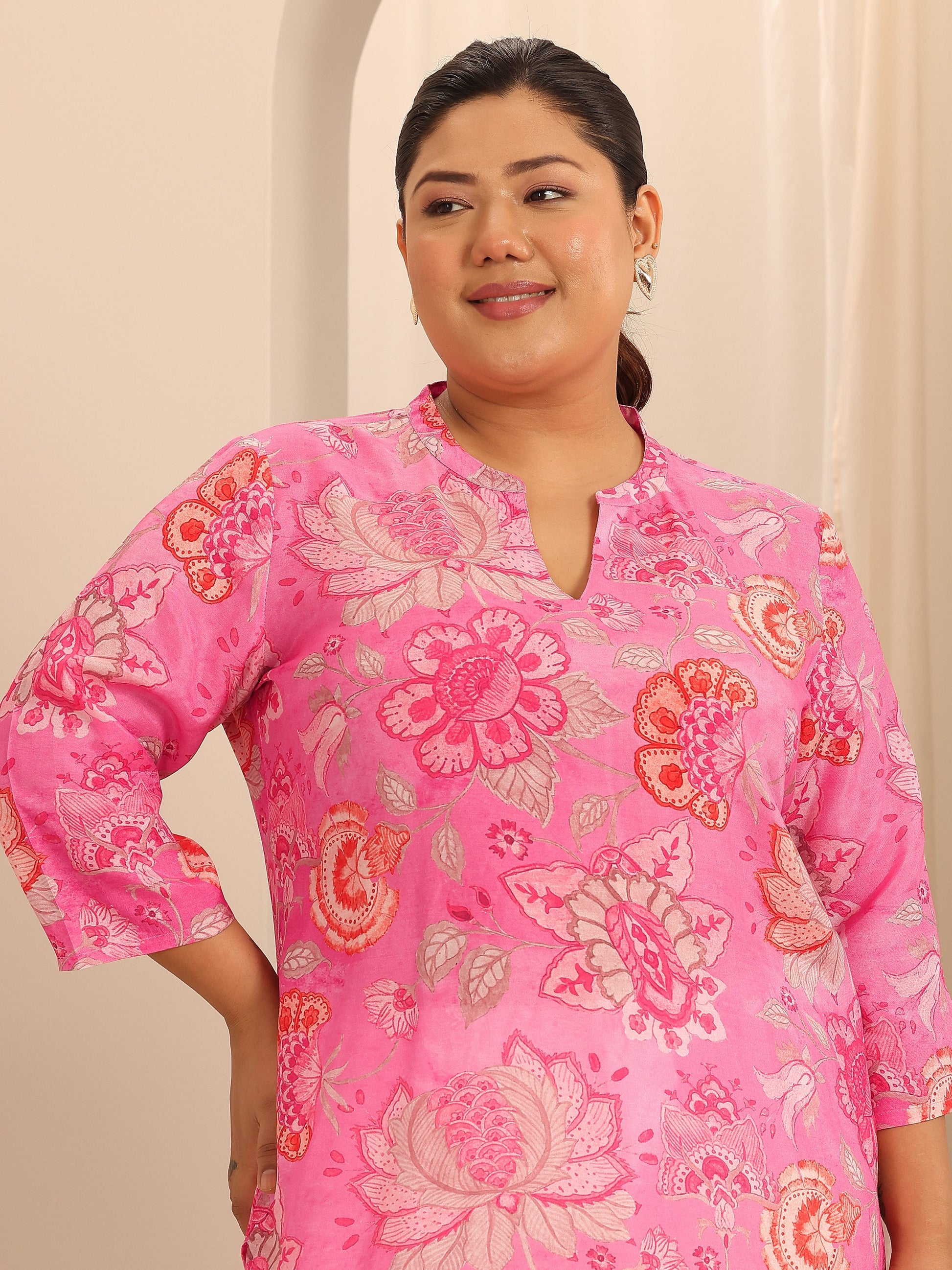 Our 1-piece pink muslin straight-fit kurta features a notched neckline, regular sleeves, and statement Yoke. Adorned with floral prints, this style is perfect for casual wear.