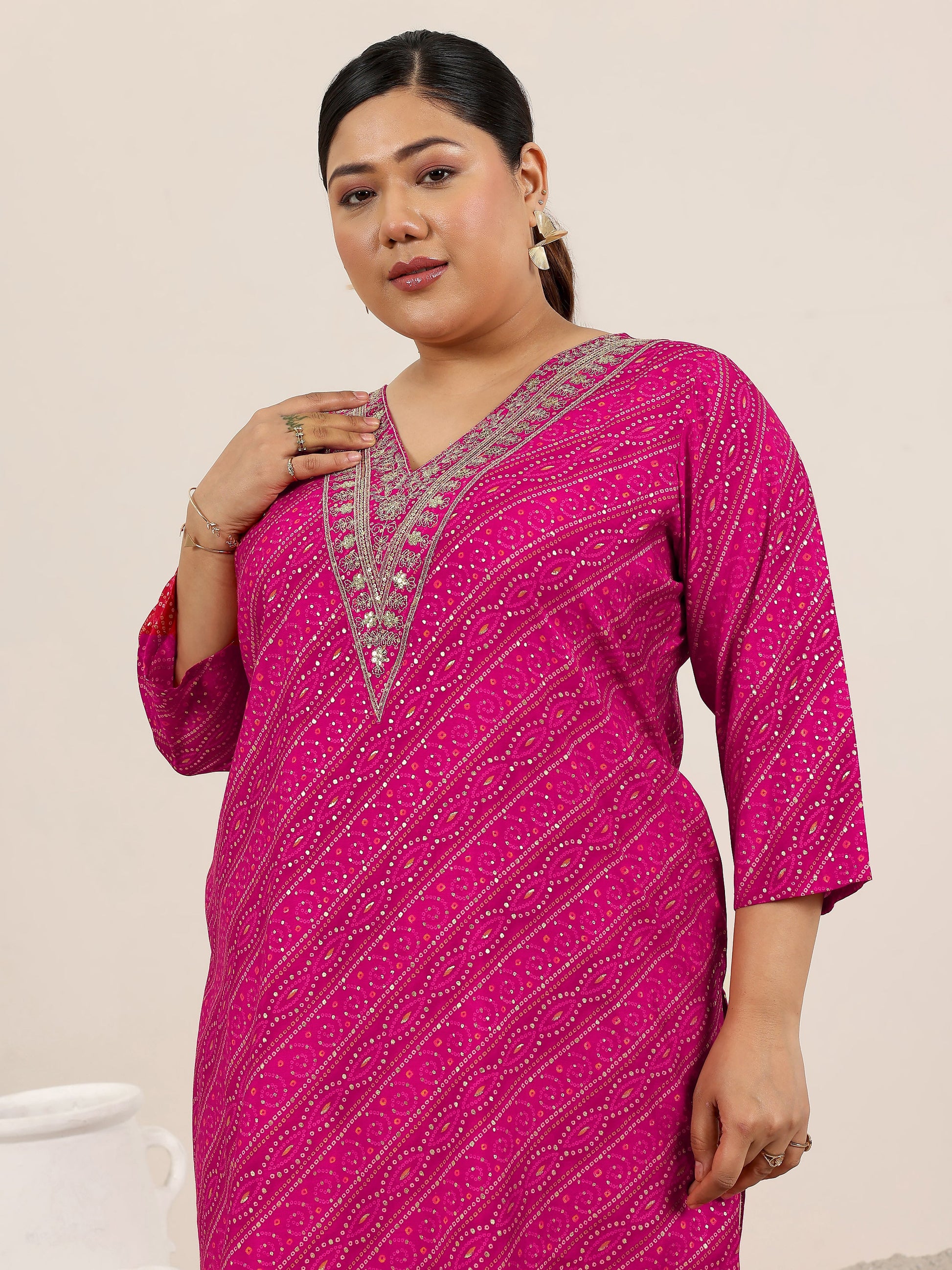 Libas Extra Love collection features our signature designs in comfortable plus sizes. Our signature designs in comfortable plus sizes. Libas Extra Love collection features our signature designs in comfortable plus sizes. Our pink silk printed straight kurta features a V-neckline, three-quarter sleeves, and three-quarter sleeves. Highlighted with Bandhani-inspired prints, Zari detailing, sequins, and roomy pockets, this style is perfect for light festivities.