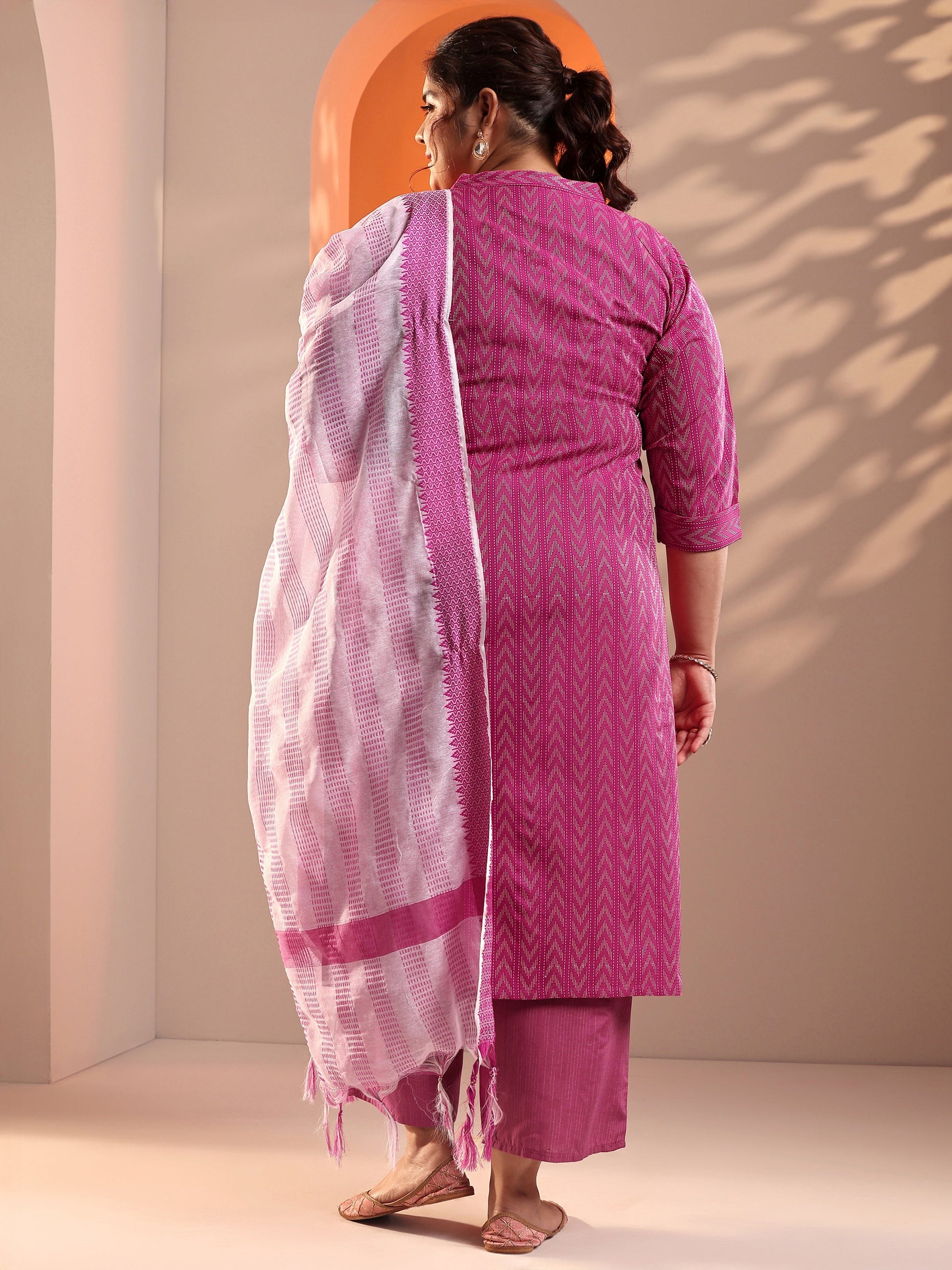 Plus Size Pink Woven Design Cotton Blend Straight Suit Set With Dupatta