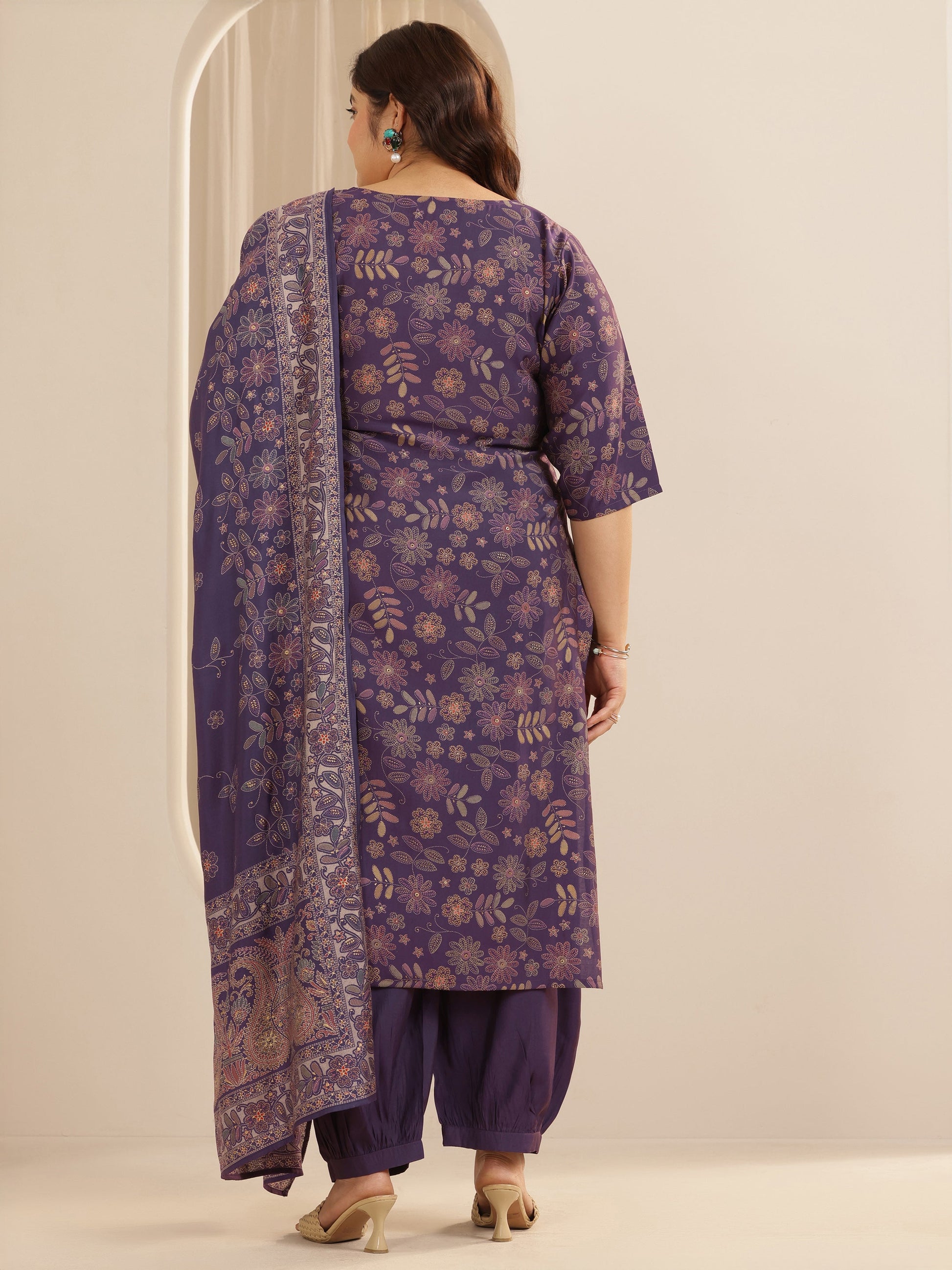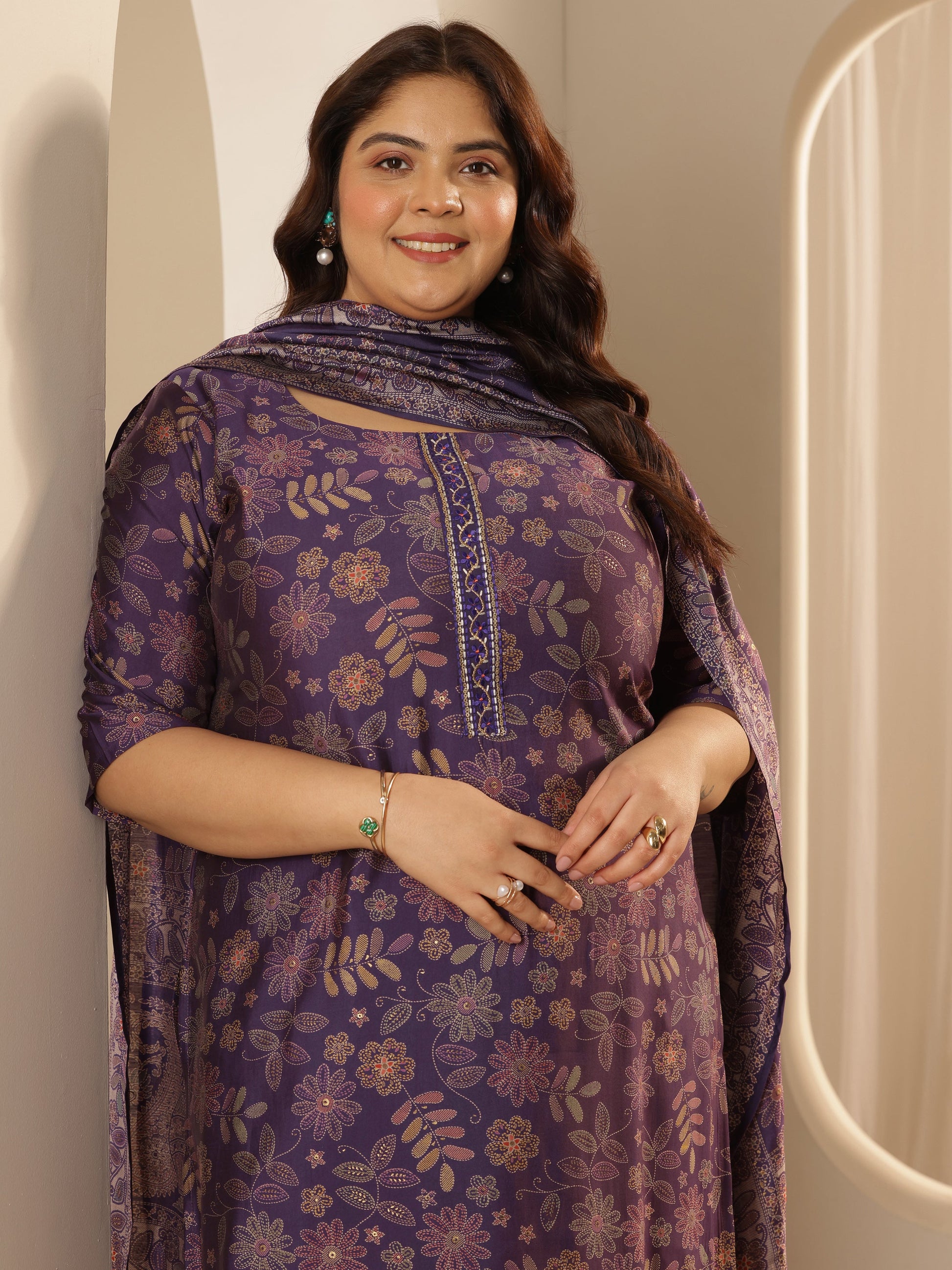 Plus Size Purple Printed Silk blend Straight Suit Set With Dupatta